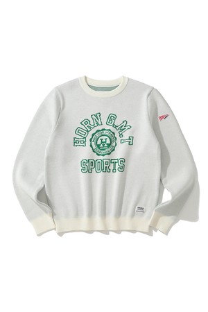 HORN GARMENT 컬리지 아이콘을 사용하여 고전적인 인상으로 완성한 크루넥 니트.
