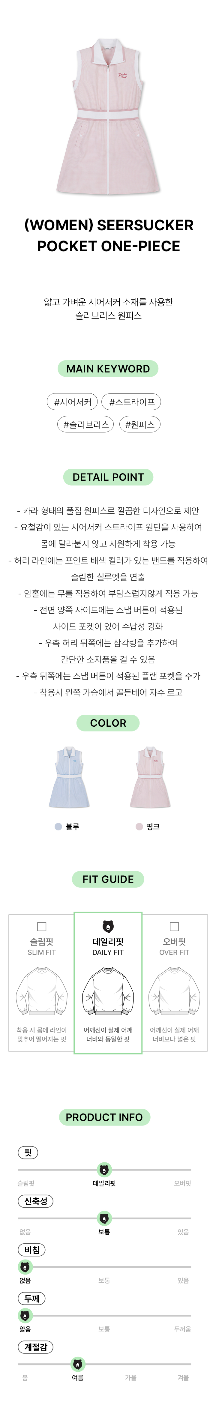 | 소재 | [원피스] 겉감: 폴리에스터 98% 폴리우레탄 2% (심지,보강재,상표,무늬,레이스,밴드 등 제외) [속바지] 겉감: 폴리에스터 87% 폴리우레탄 13% (심지,보강재,상표,무늬,레이스,밴드 등 제외) |