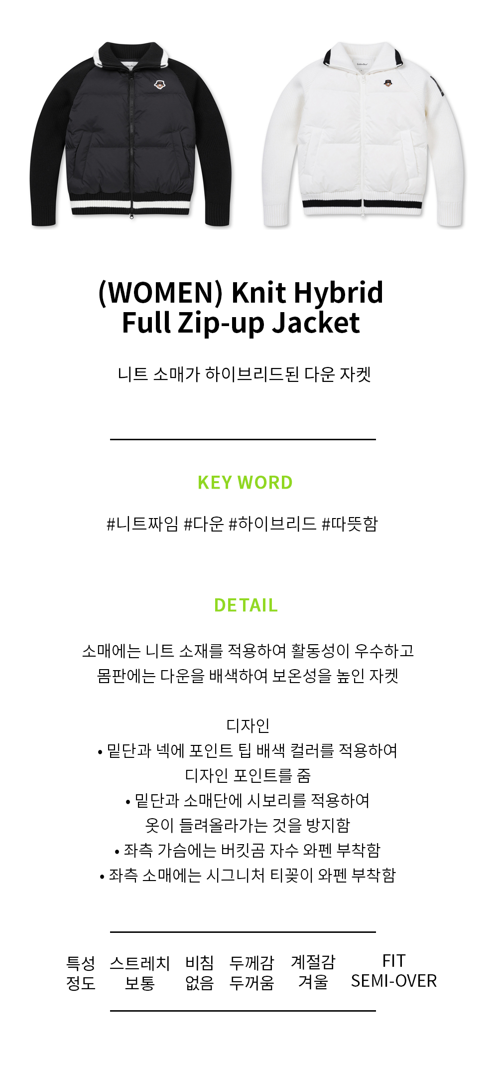 | 소재 | 겉감: 나일론 100% 배색: 아크릴 65% 모 28% 나일론 7% 안감: 나일론 100% 충전재: 솜털 80% 깃털 20% (심지,보강재,상표,무늬,레이스,밴드 등 제외) |