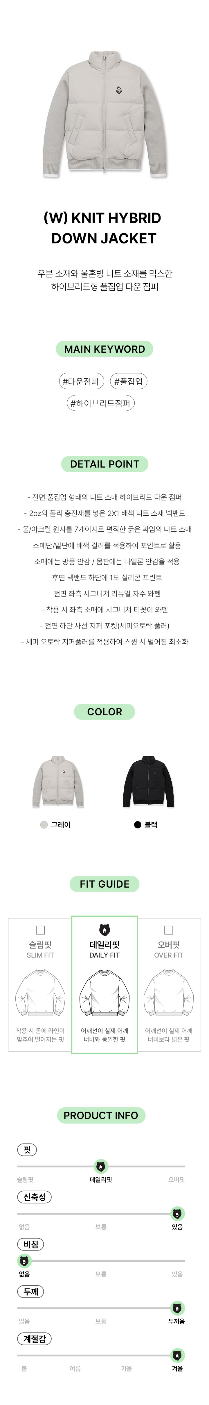 | 소재 | 겉감: 나일론 69% 폴리우레탄 31% 배색: 아크릴 66% 모 28% 나일론 6% 안감1,2: 나일론 100% 충전재: 오리 솜털 80% 깃털 20% (심지,보강재,상표,무늬,레이스,밴드 등 제외) |