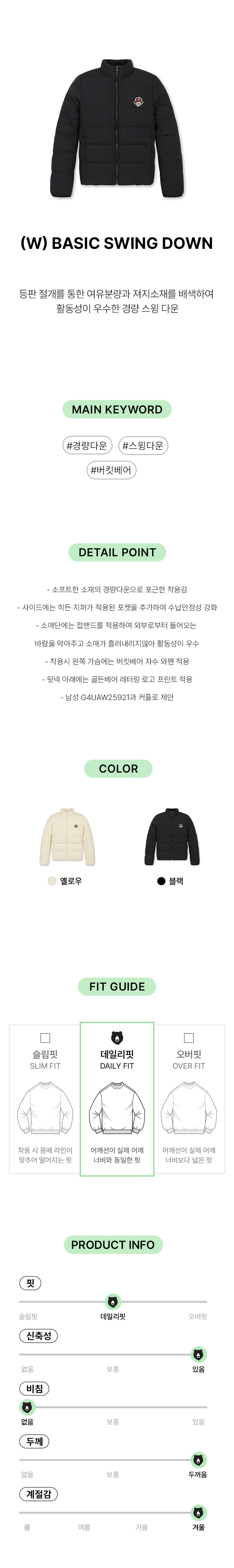 | 품질보증기준 | 코오롱 인더스트리㈜FnC부문 제품의 품질보증기간은 구입일로부터 1년, 입점사 제품의 경우, 업체마다 다를 수 있음 그 외 기준은 관련법 및 소비자분쟁해결 규정에 따름 |