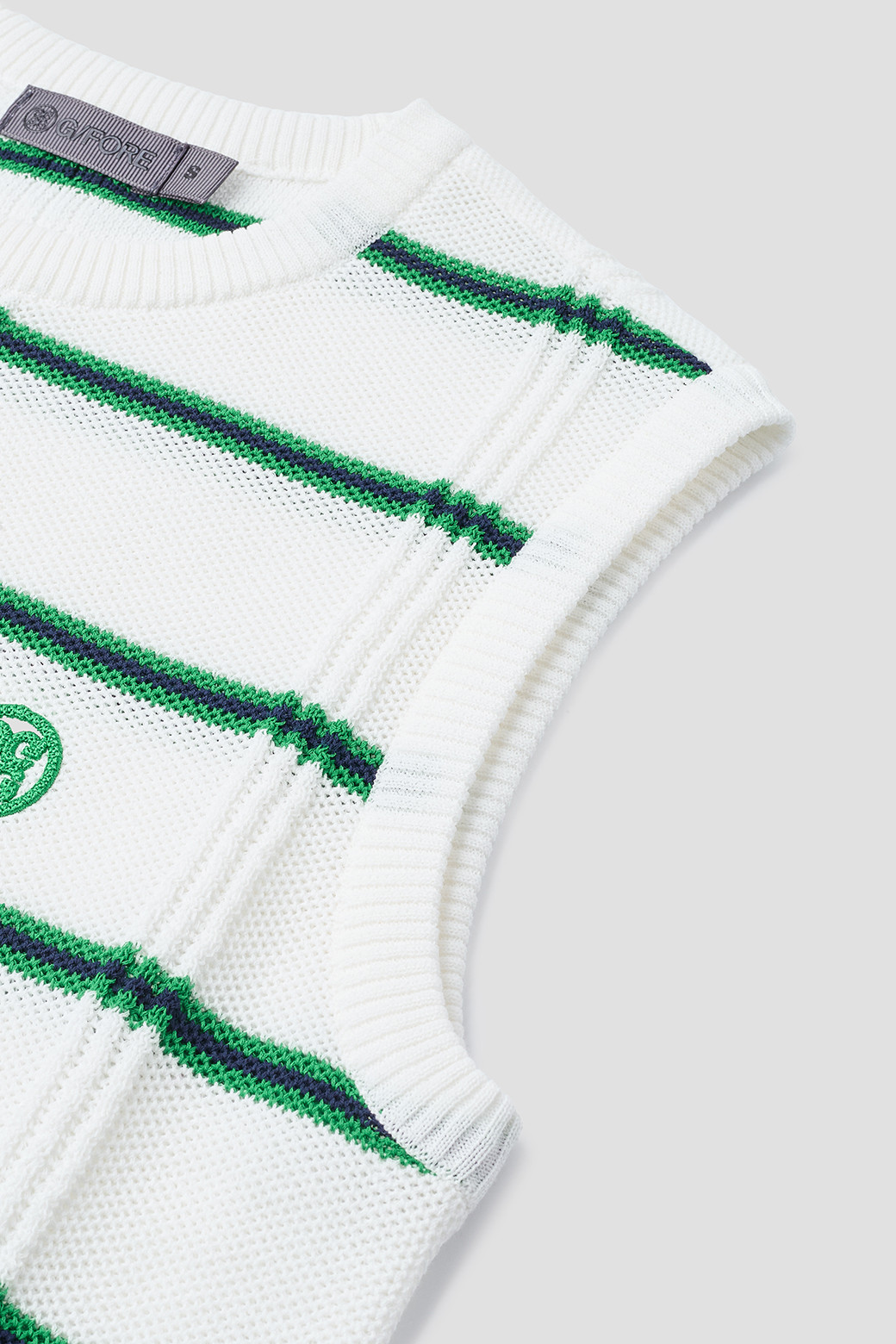 - 레이온 폴리 혼방 원사로 제작된 슬리브리스 스웨터.