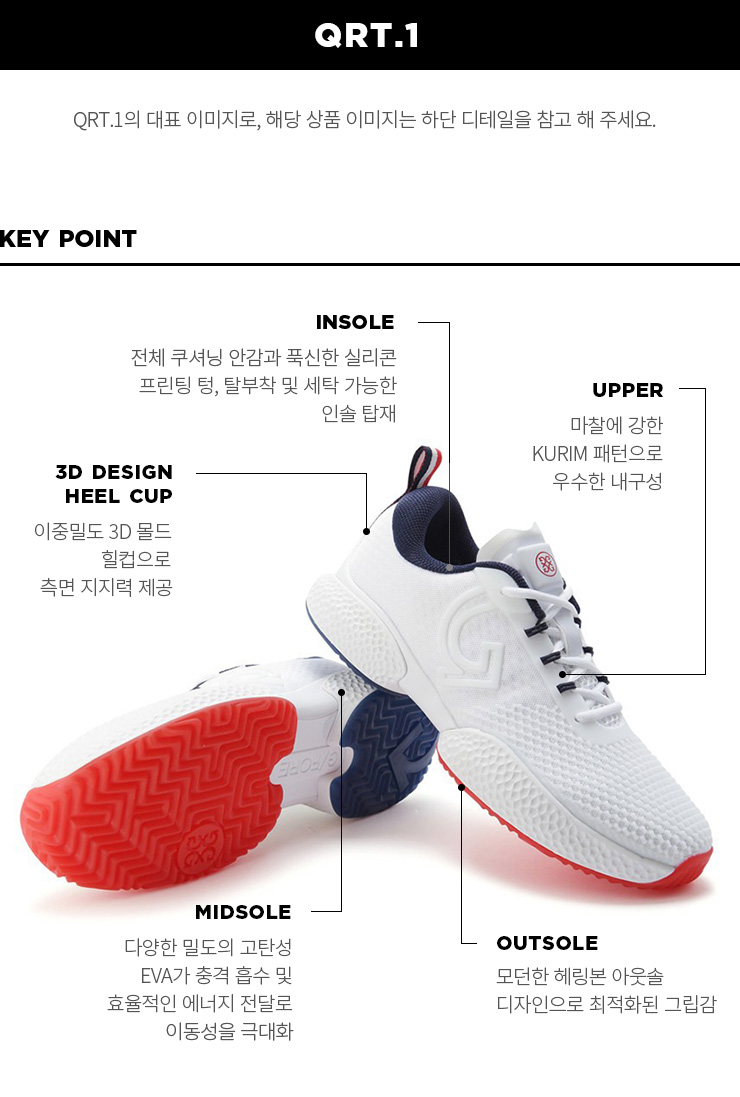 - G/FORE가 2023년 새로이 선보이는 슈즈, QRT는 테니스, 농구, 피클볼 코트(COURT)에서 최적의 성능을 자랑할 수 있는 신발이며, 지포어만의 위트있는 언어유희를 통해 지어진 네이밍이 돋보이는 아이템입니다.