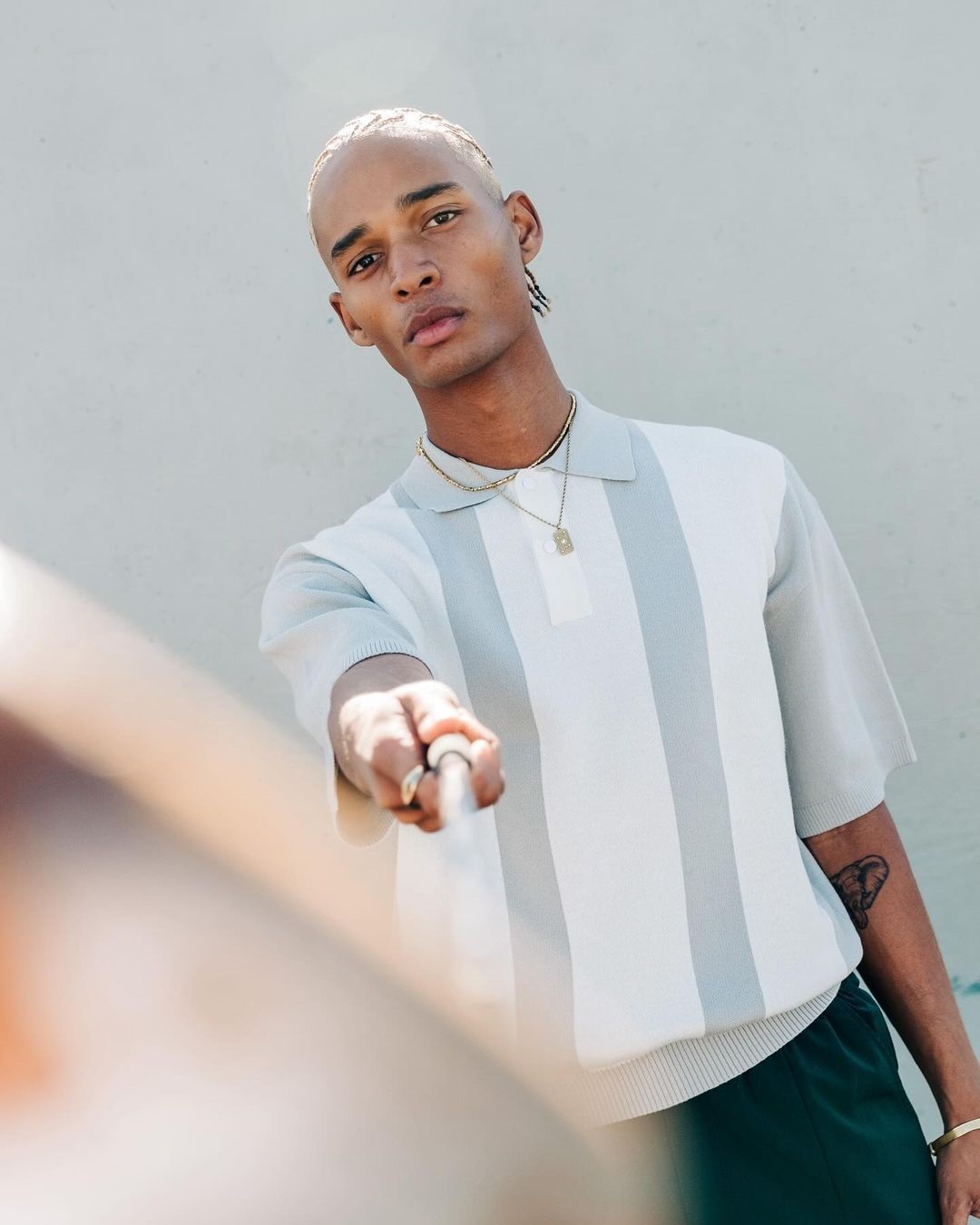 시그니처 투명 폴리 라벨로 마감된 부드러운 풀 패션 니트 반팔 폴로 스웨터입니다.