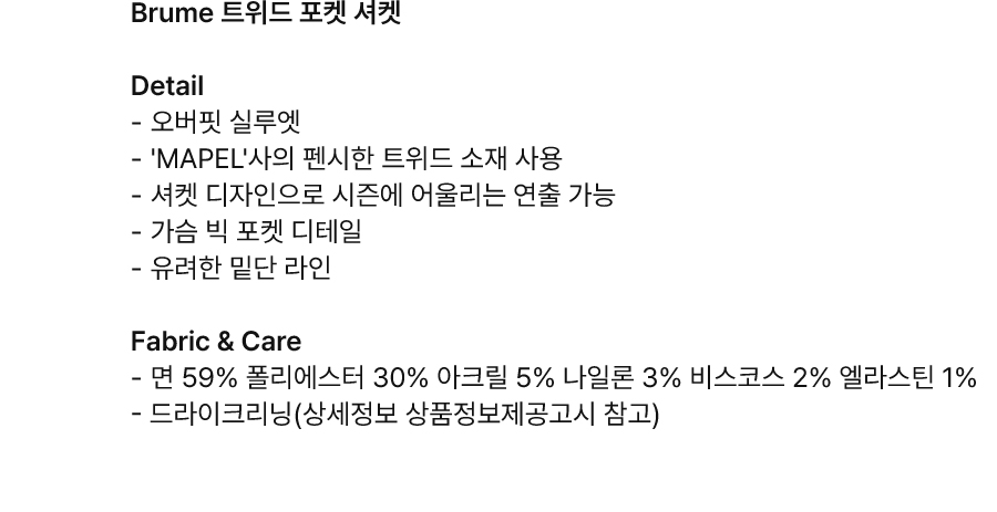 | 소재 | 겉감: 면 62% 폴리에스터 27% 나일론 6% 레이온 5% 배색: 폴리에스터 100% (심지,보강재,상표,무늬,레이스,밴드 등 제외) |