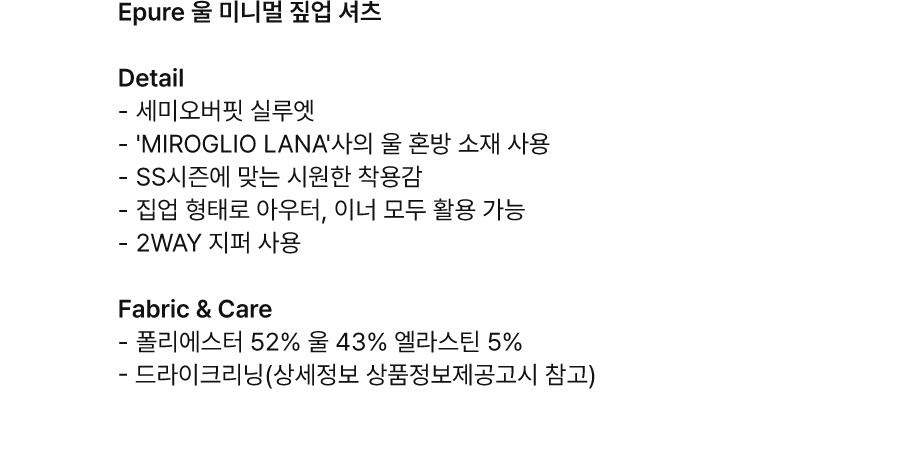소재 | 겉감: 폴리에스터 53% 모 42% 폴리우레탄 5% 안감: 폴리에스터 100% (심지,보강재,상표,무늬,레이스,밴드 등 제외) |