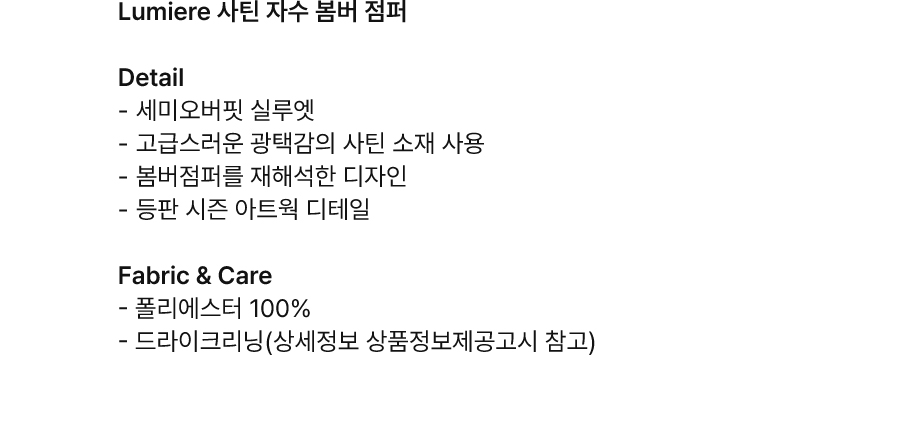 | 소재 | 겉감: 폴리에스터 100% 안감: 레이온 61% 면 39% 배색: 폴리에스터 96% 폴리우레탄 4% (심지,보강재,상표,무늬,레이스,밴드 등 제외) |