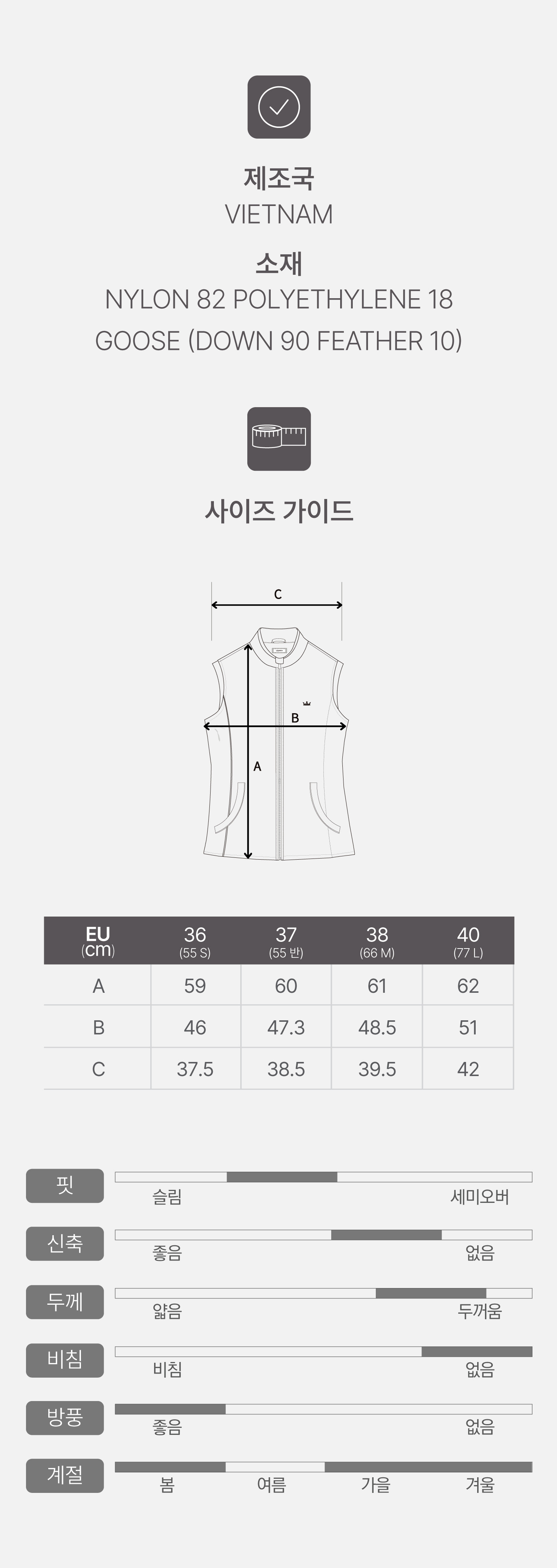 소재NYLON 82% POLYESTER 18% / GOOSE (DOWN 90% FEATHER 10%)