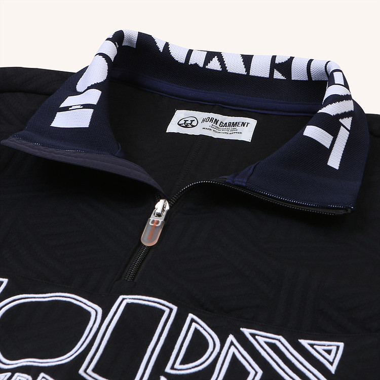 ・가슴의 기하학 로고 자수와 밑단의 MID CENTURY 풍 피스네임이 브랜드의 아이덴티티를 더함