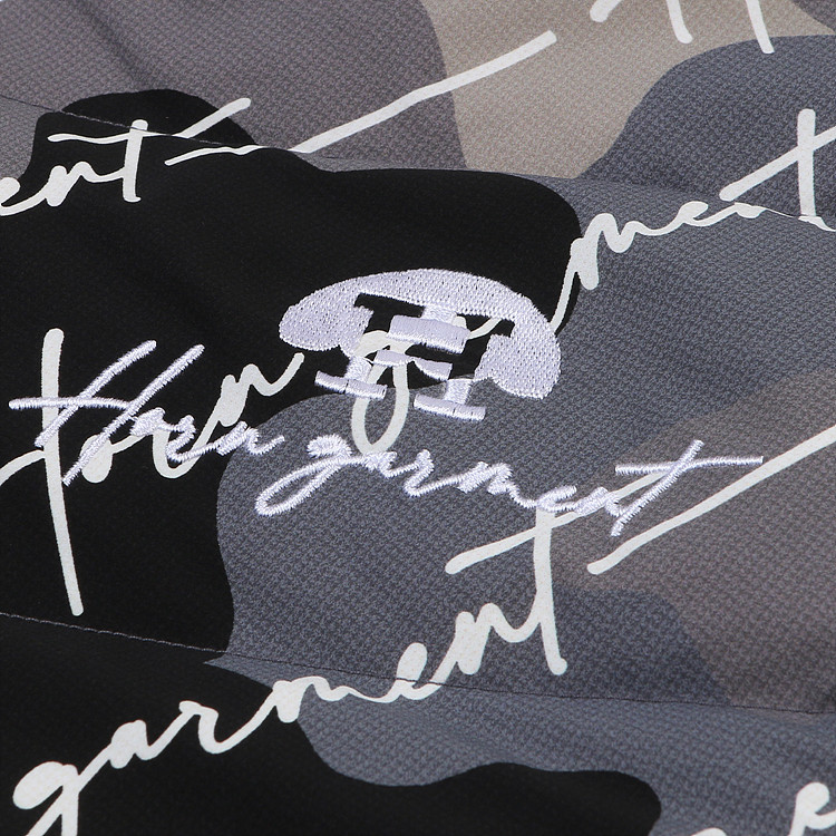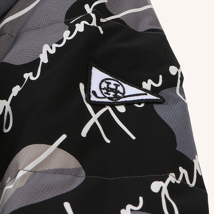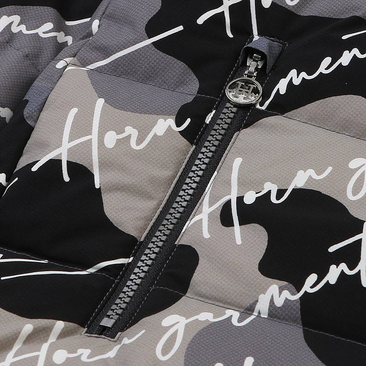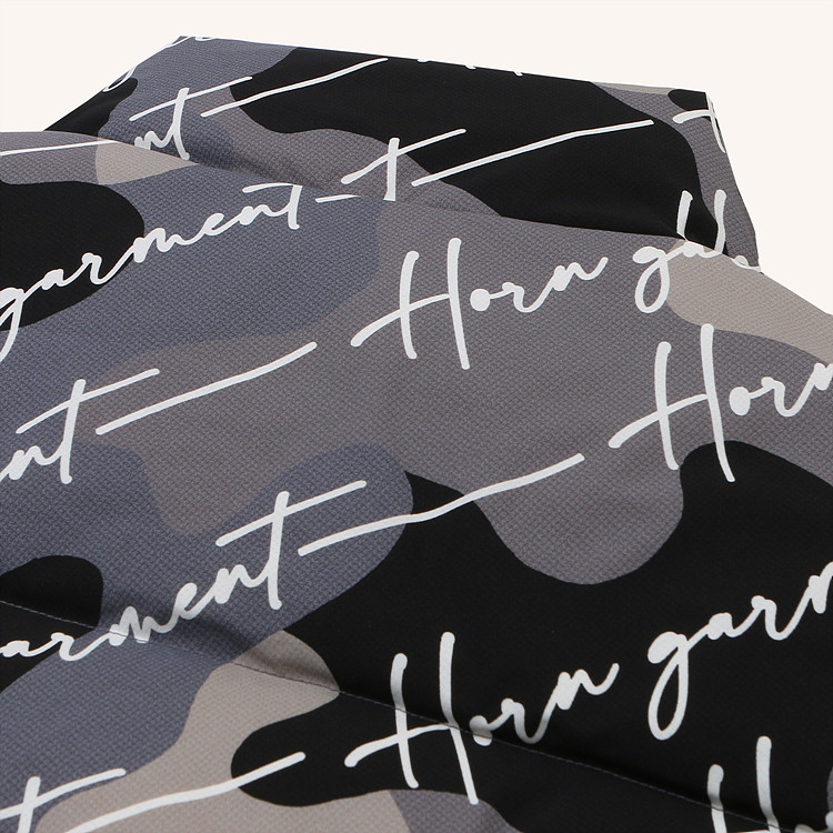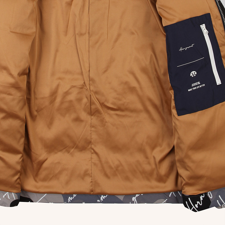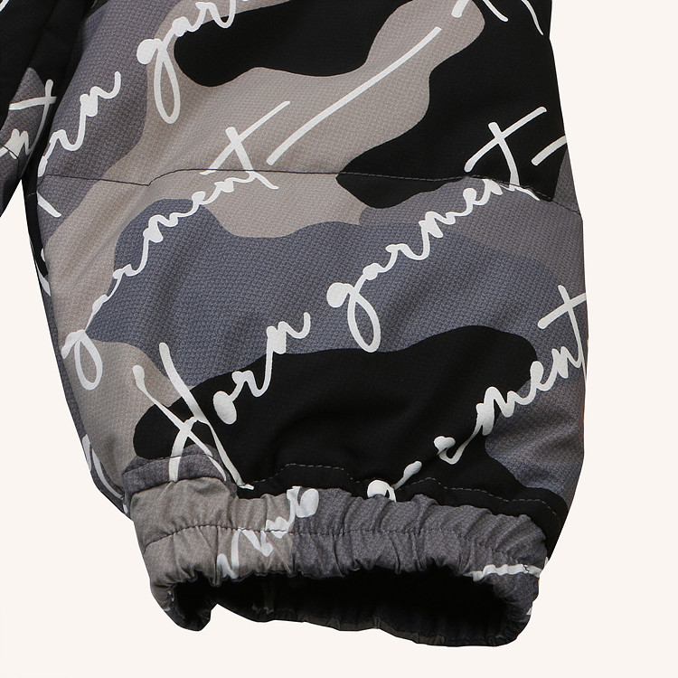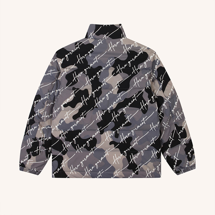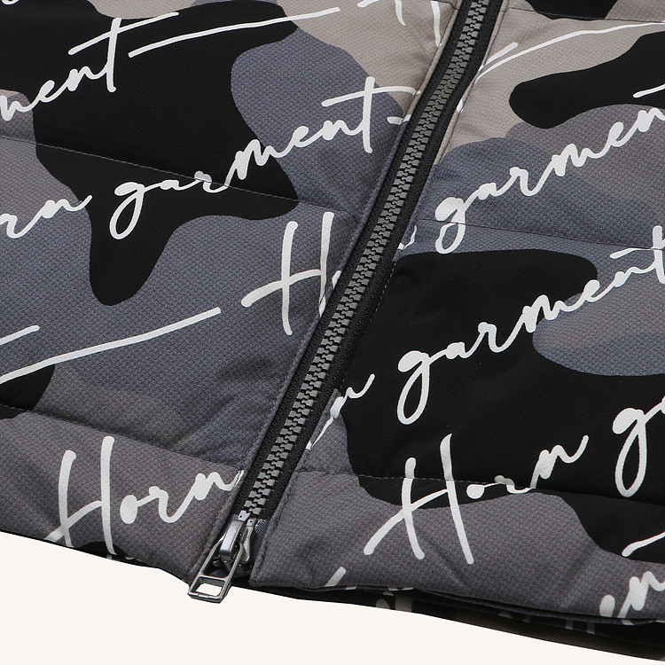 ・옅은 톤의 카모플라주 패턴과 필기체 로고 패턴의 MIX 패턴이 돋보이는 다운 자켓