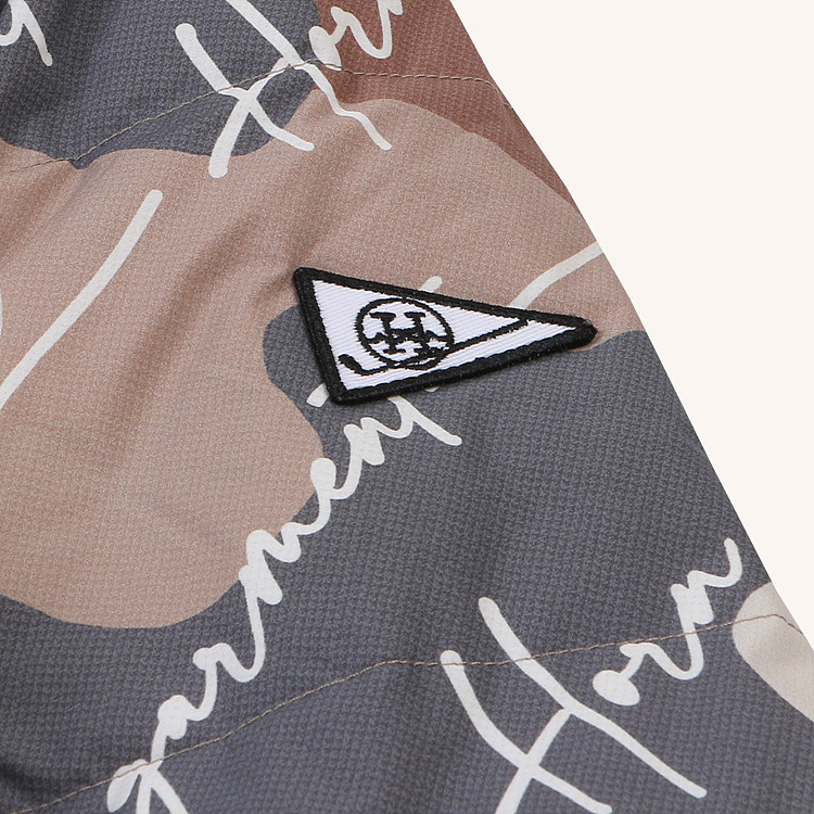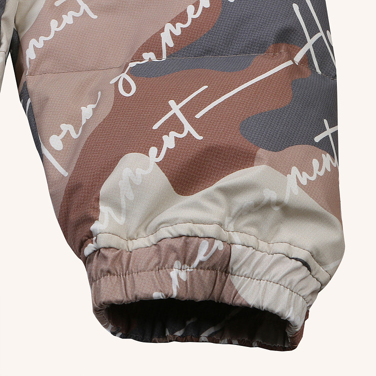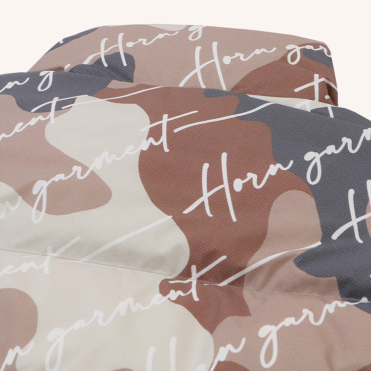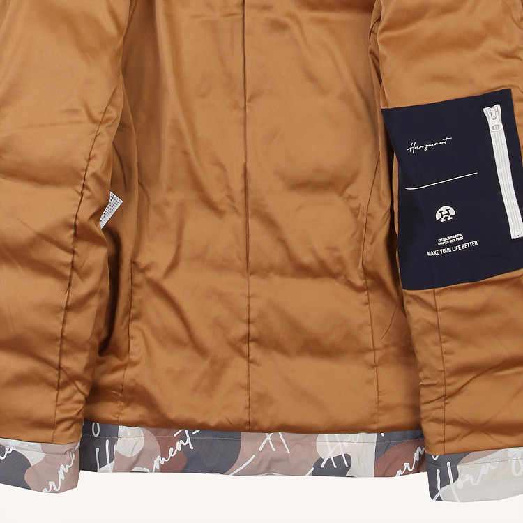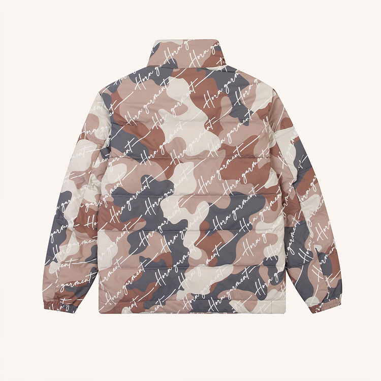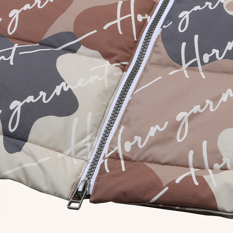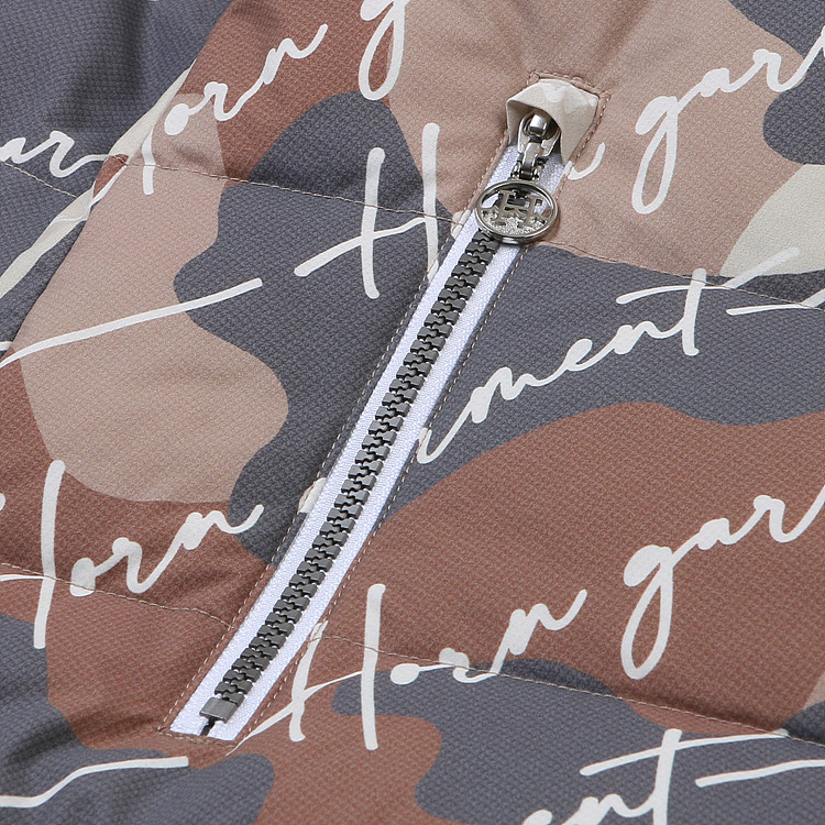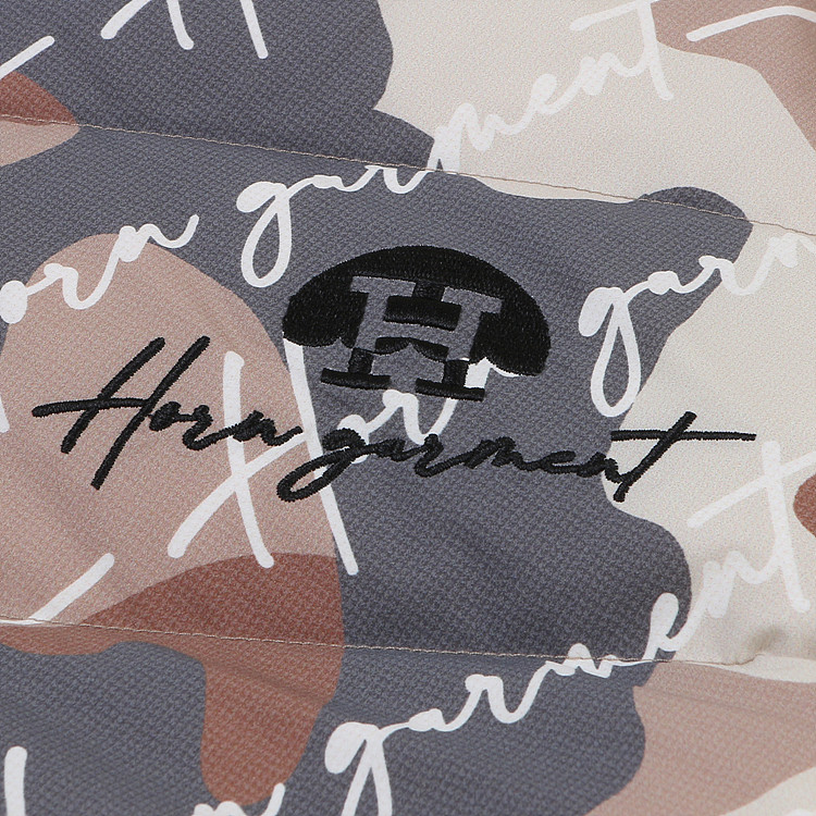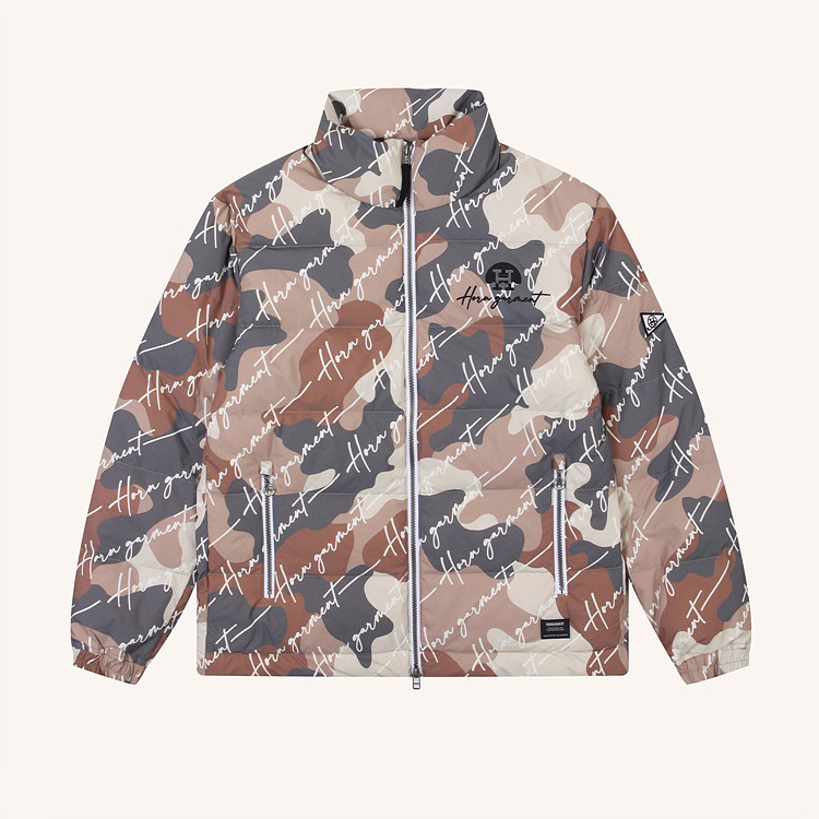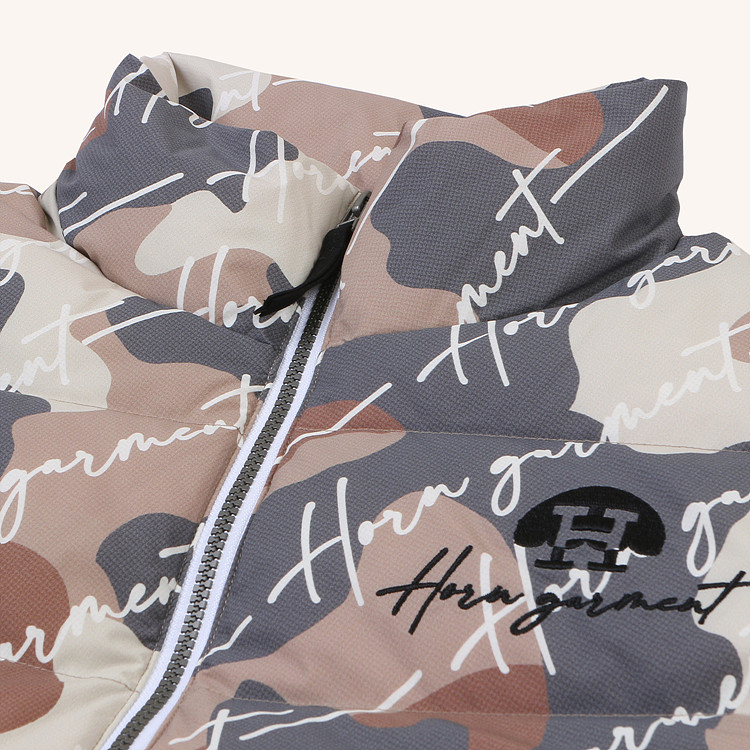 ・옅은 톤의 카모플라주 패턴과 필기체 로고 패턴의 MIX 패턴이 돋보이는 다운 자켓