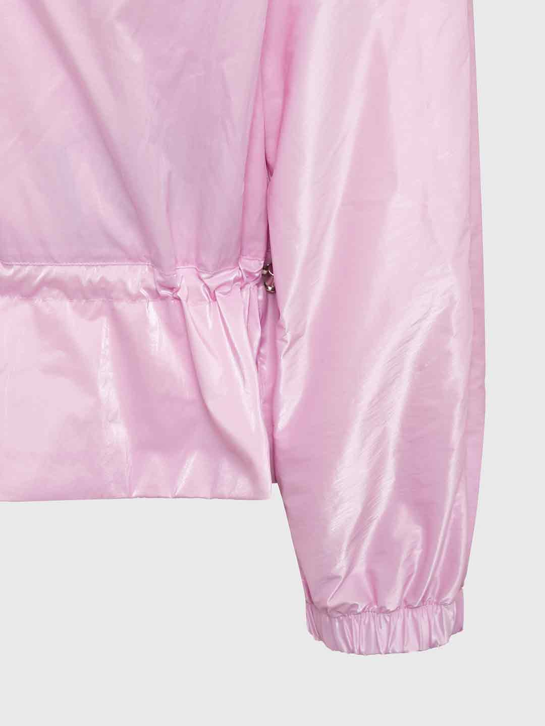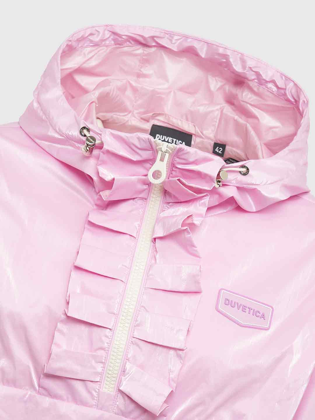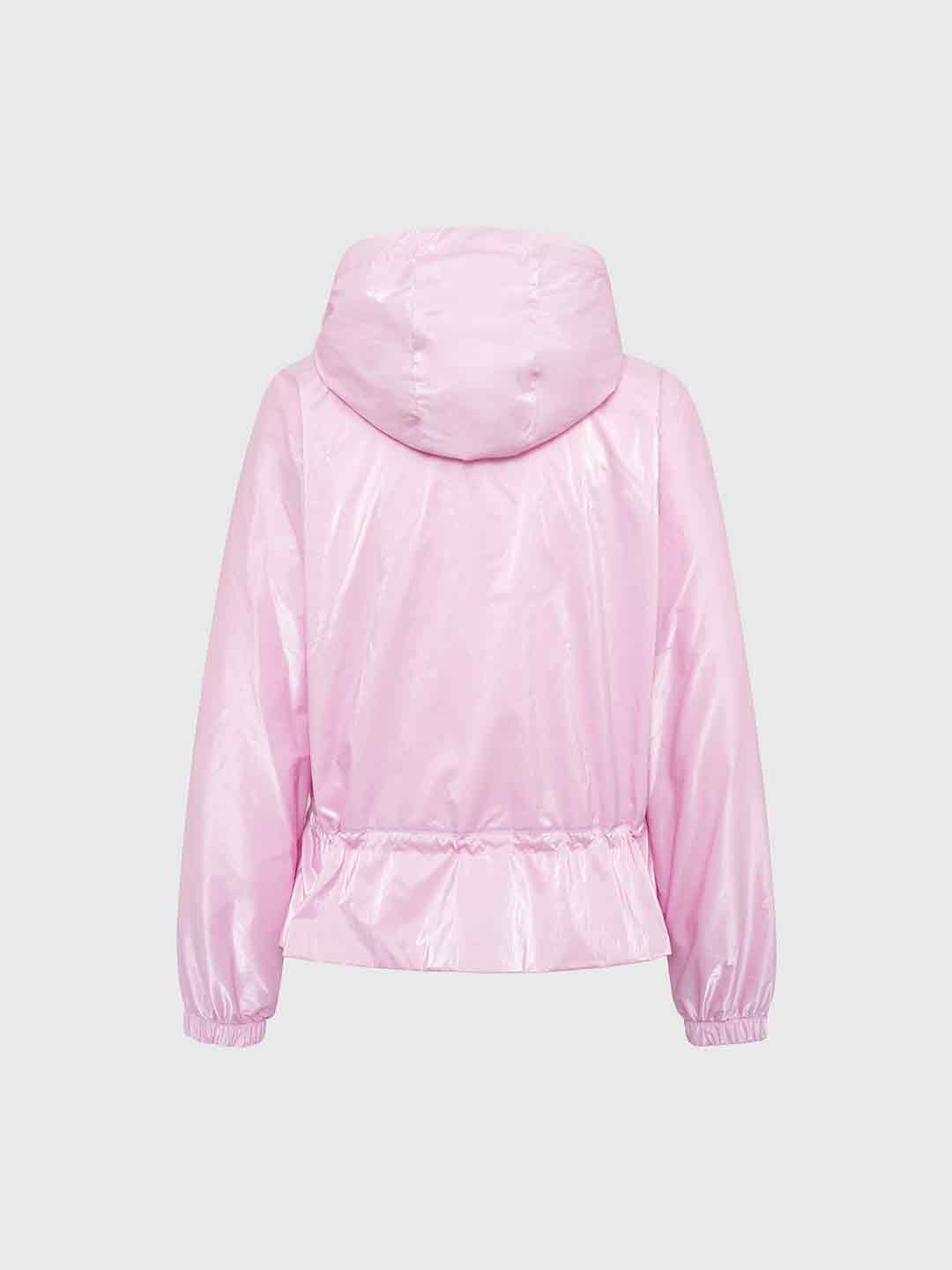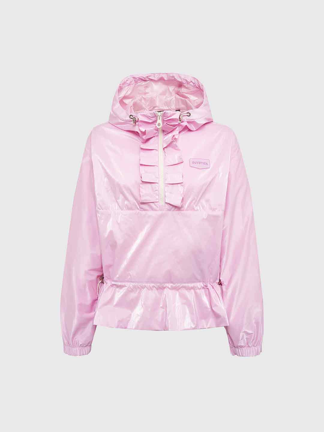 프릴의 여성적인 디테일이 돋보이는 페미닌 후드 바람막이 아노락입니다.