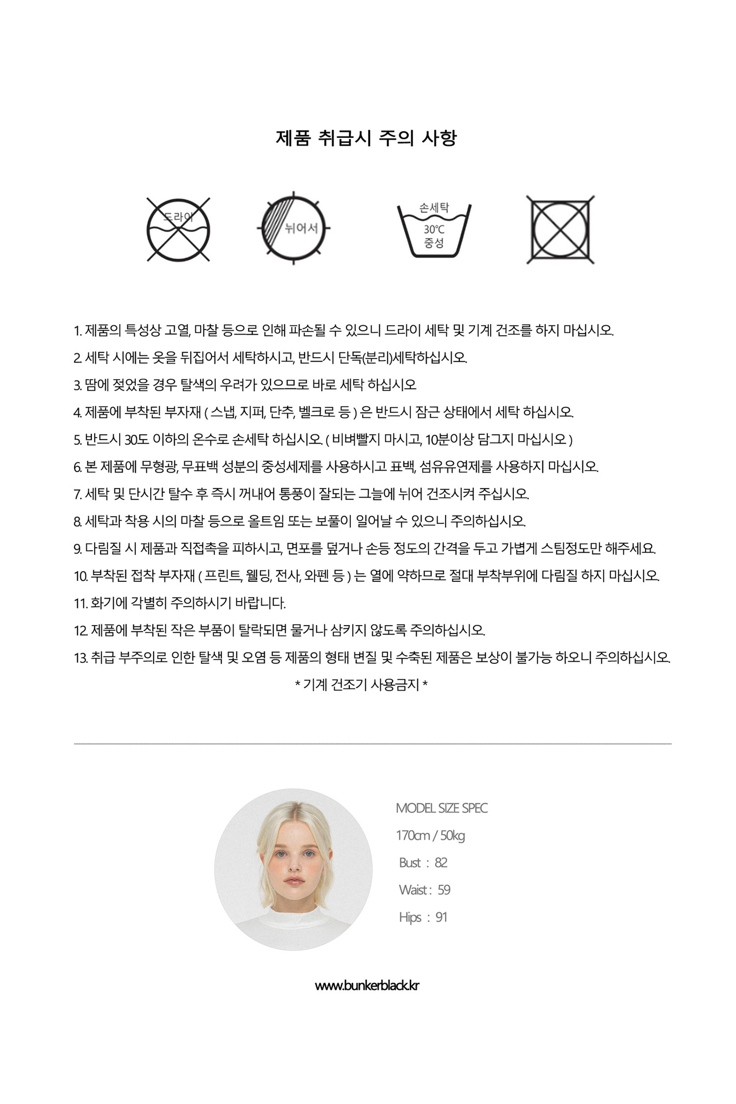 | 품질보증기준 | 본 제품은 정부 고시 소비자분쟁해결 기준에 의거하여 고객의 피해를 보상해드립니다. ① 원단불량, 부자재불량, 봉제불량 및 소재구성 부적합으로 인한 세탁사고 : 무상수리, 교환, 환급 순으로 보상. ② 사이즈가 맞지 않거나 디자인/색상 불만 : 배송완료일로부터 7일 이내로서 제품의 손상이 없는 경우 교환 또는 환급 |
