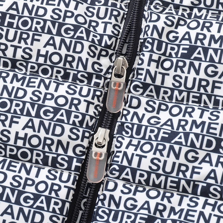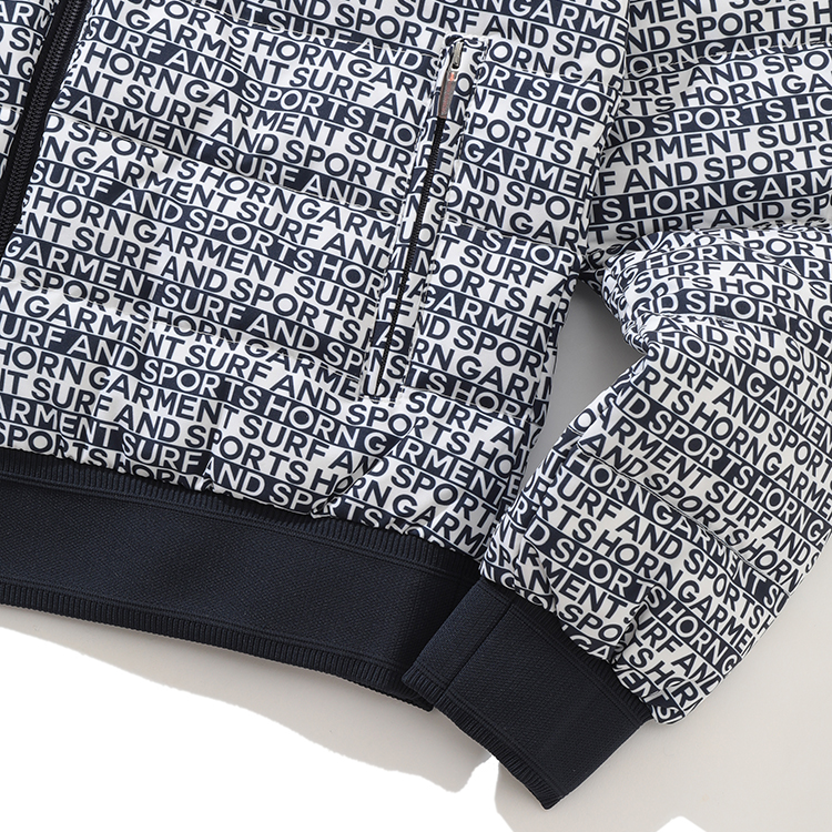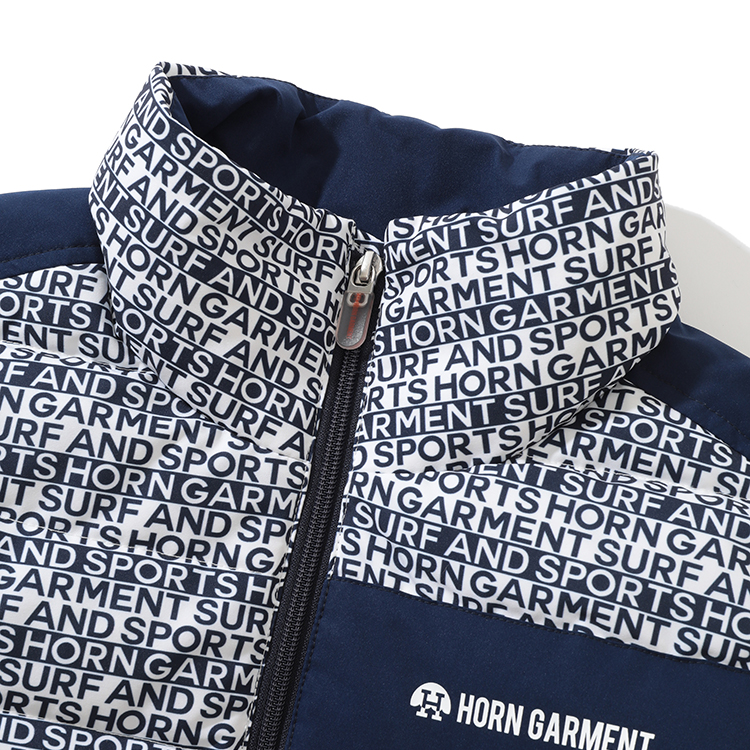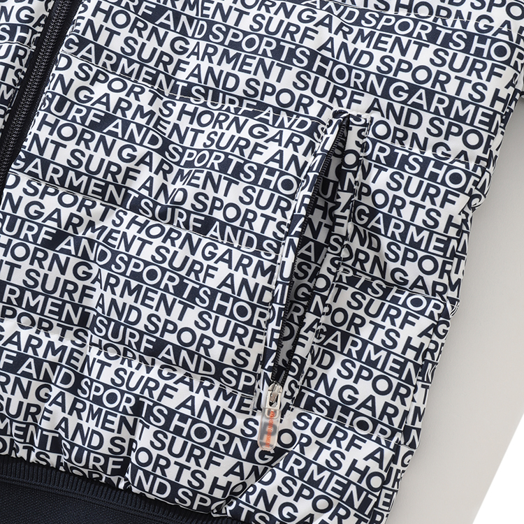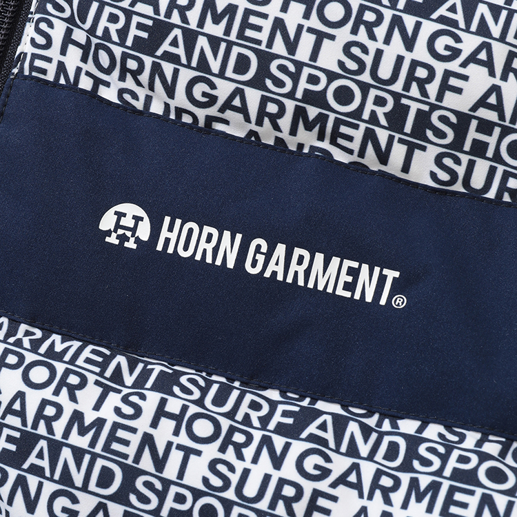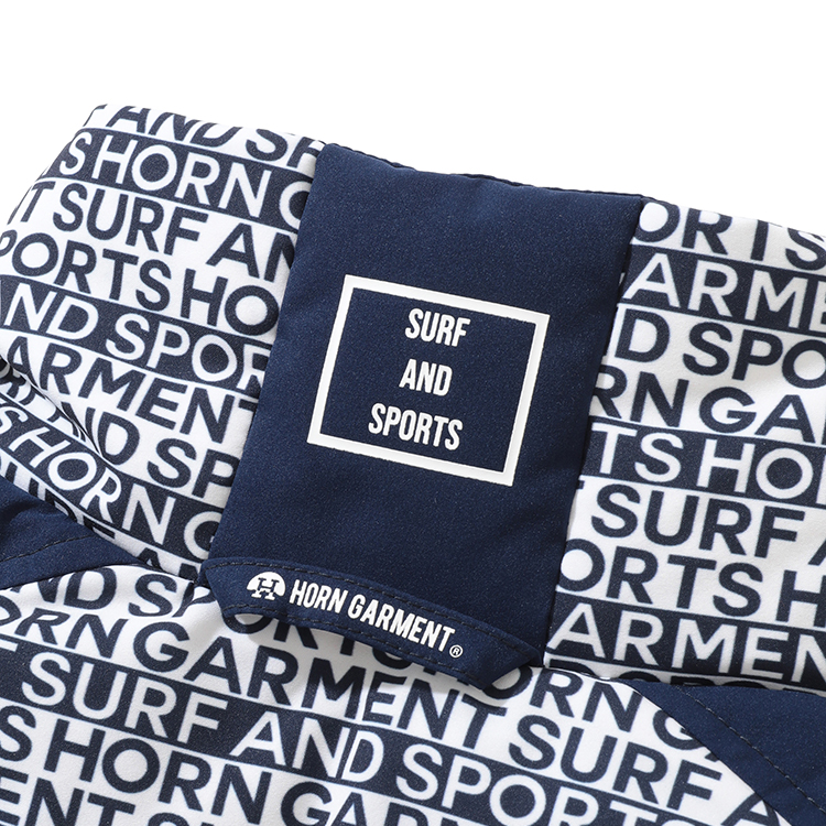 전면에 HORN GARMENT 와 SURF AND SPORTS를 다른 열에 배치한 패턴 프린트가 디자인에 디테일을 더함