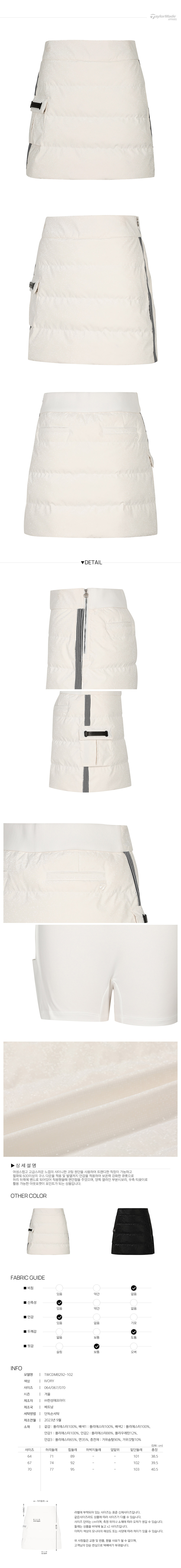 | 소재 | 겉감 : 폴리에스터100%, 배색1 : 폴리에스터100%, 배색2 : 폴리에스터100%, 안감1 : 폴리에스터100%, 안감2 : 폴리에스터88%, 폴리우레탄12%, 안감3 : 폴리에스터65%, 면35%, 충전재 : 거위솜털90%, 거위깃털10% |
