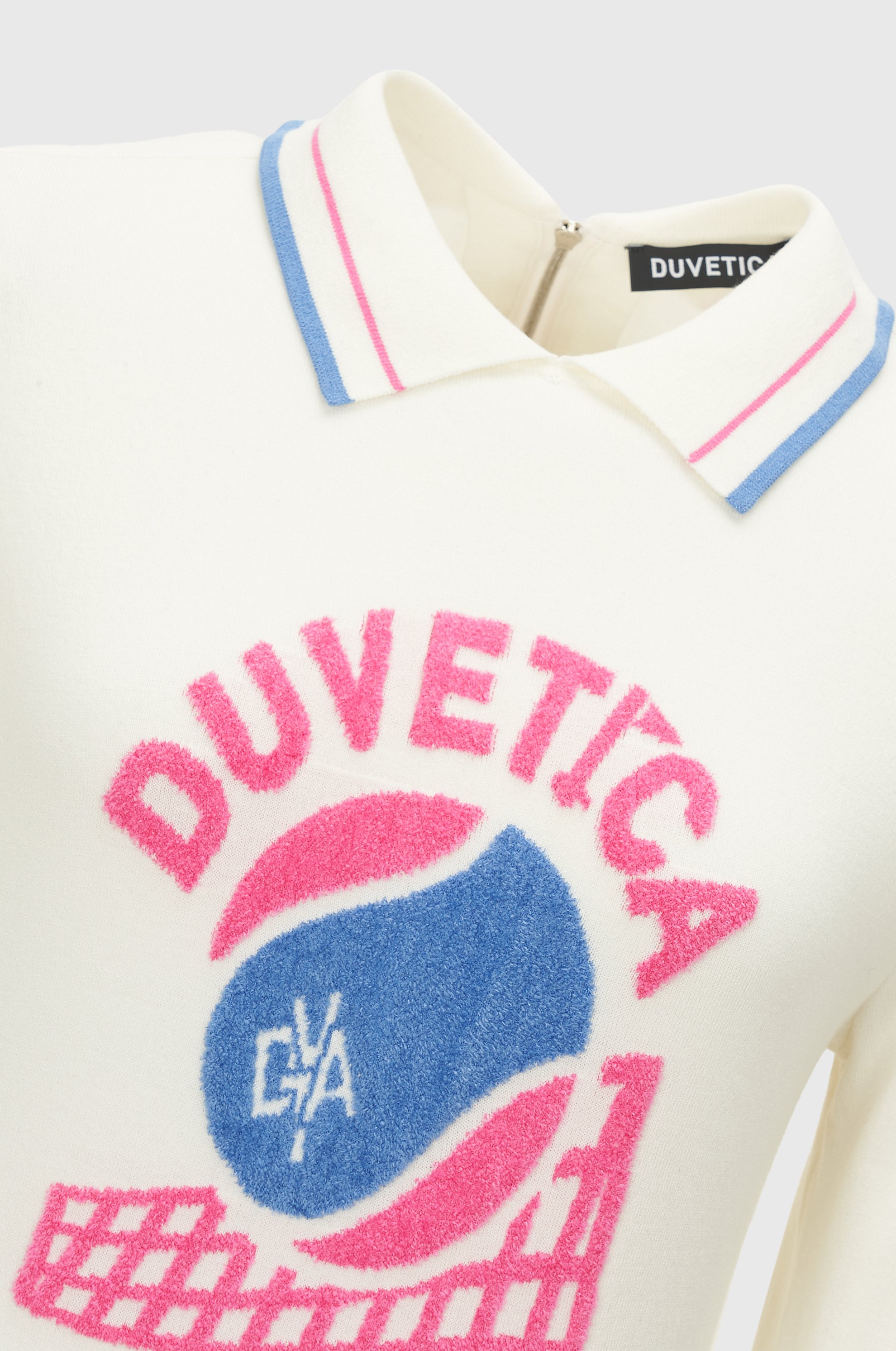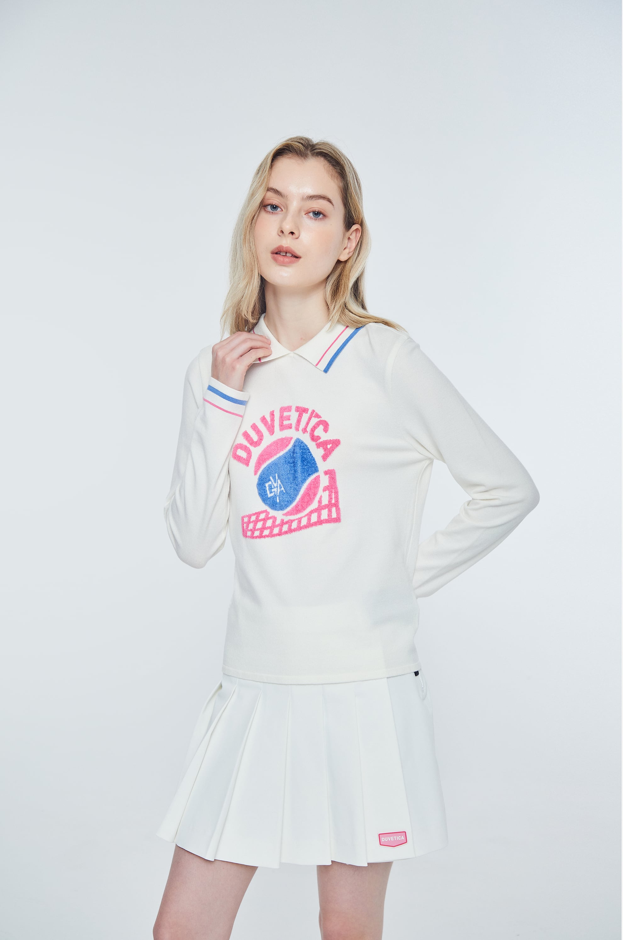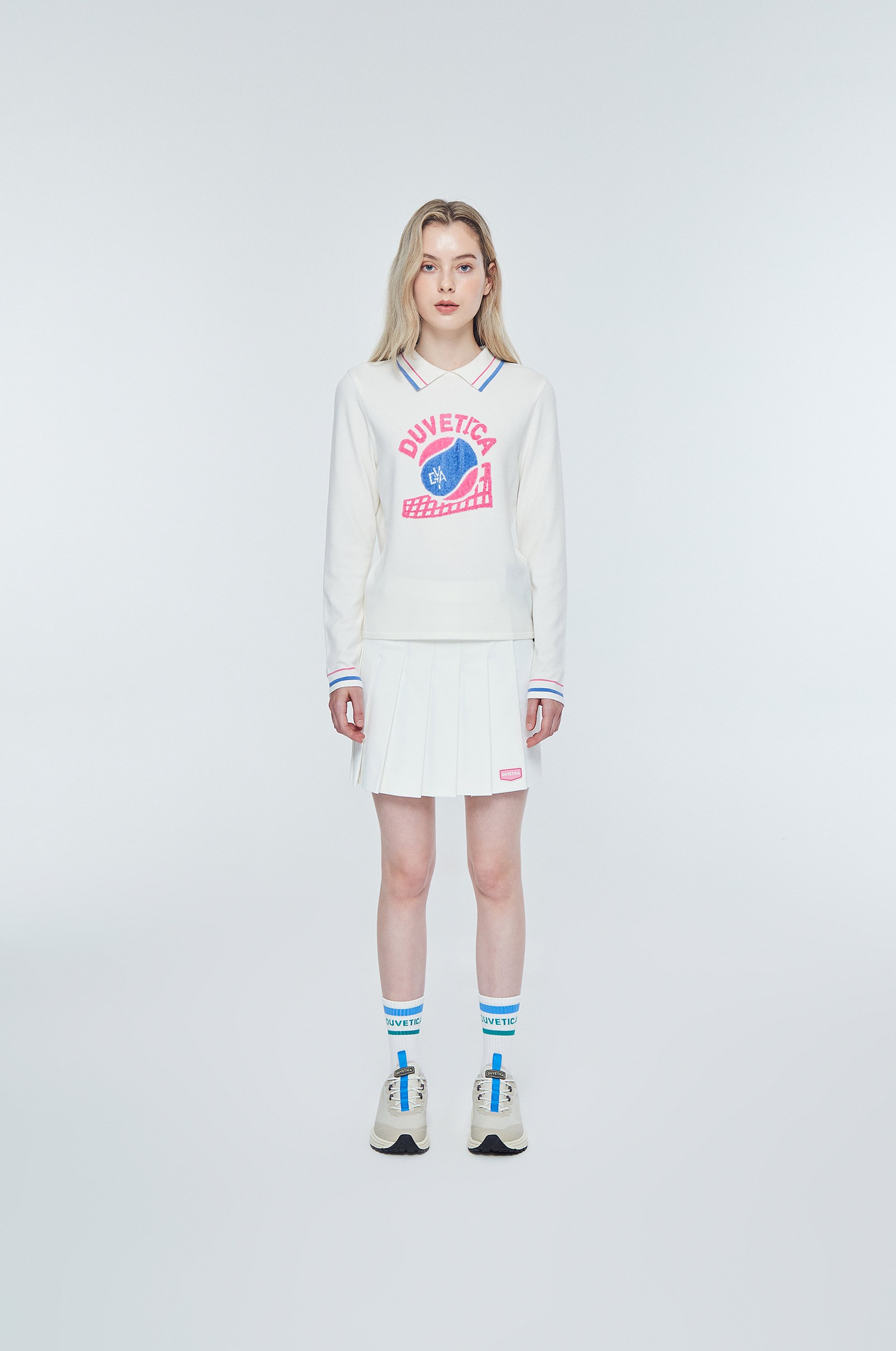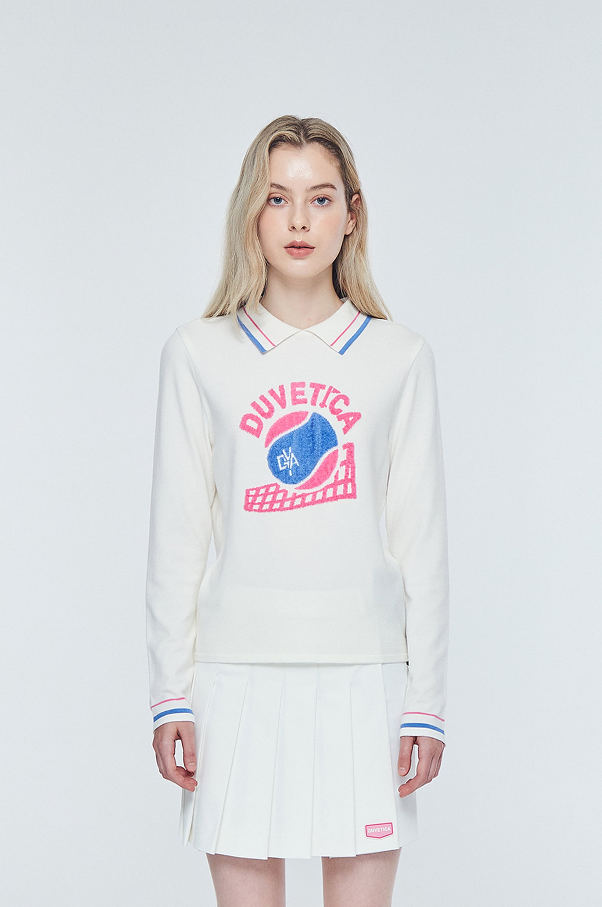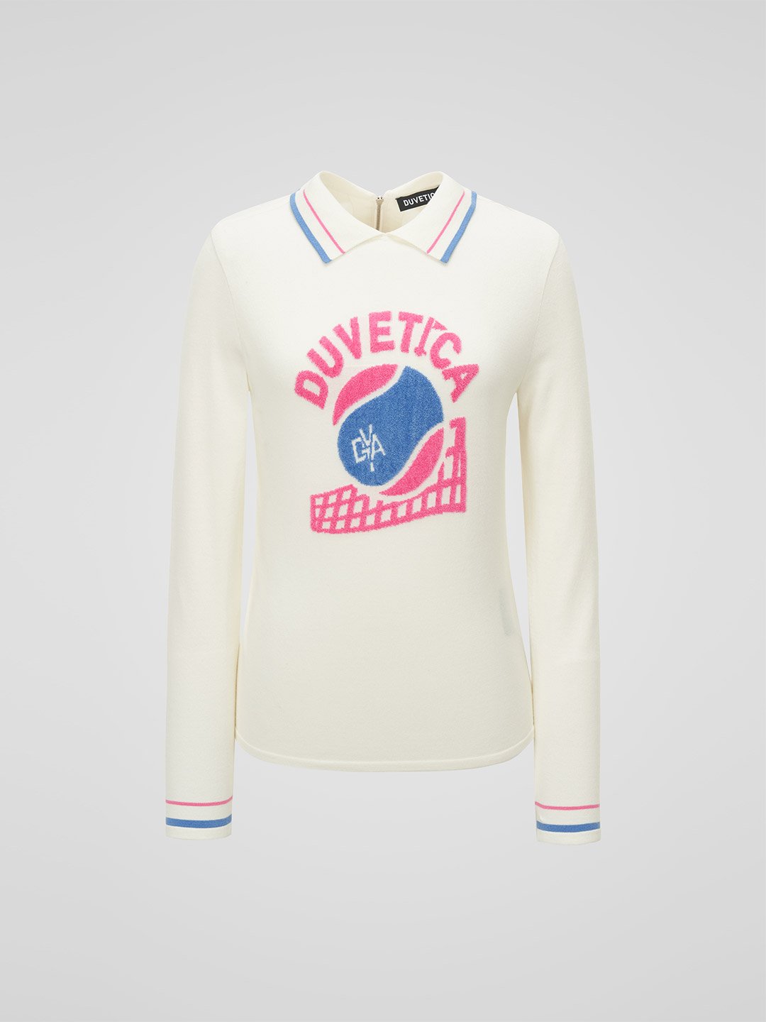- 인타르시아 기법의 테니스 볼, 매트 그래픽, 레터링 로고가 적용된 카라 니트 풀오버
