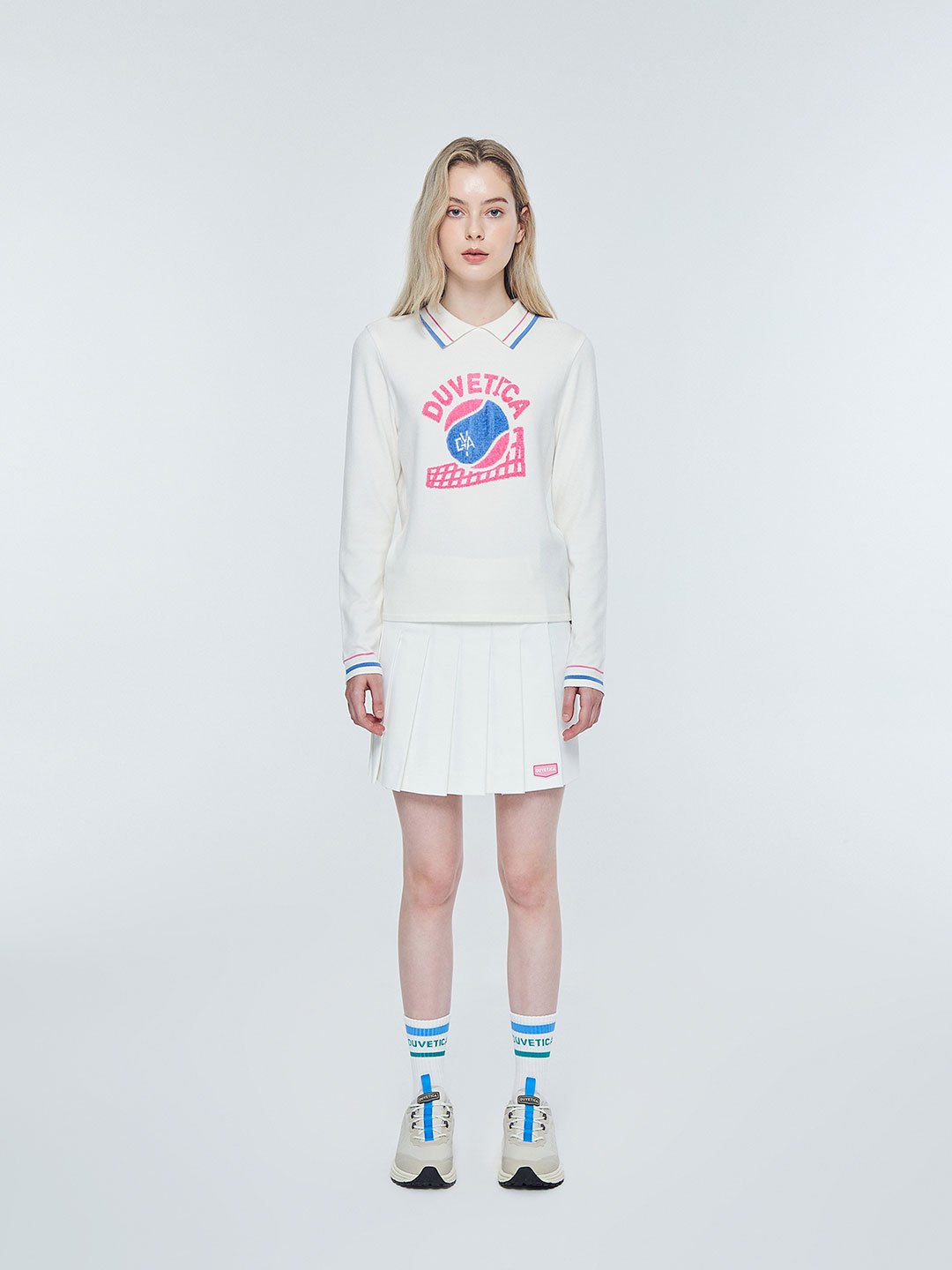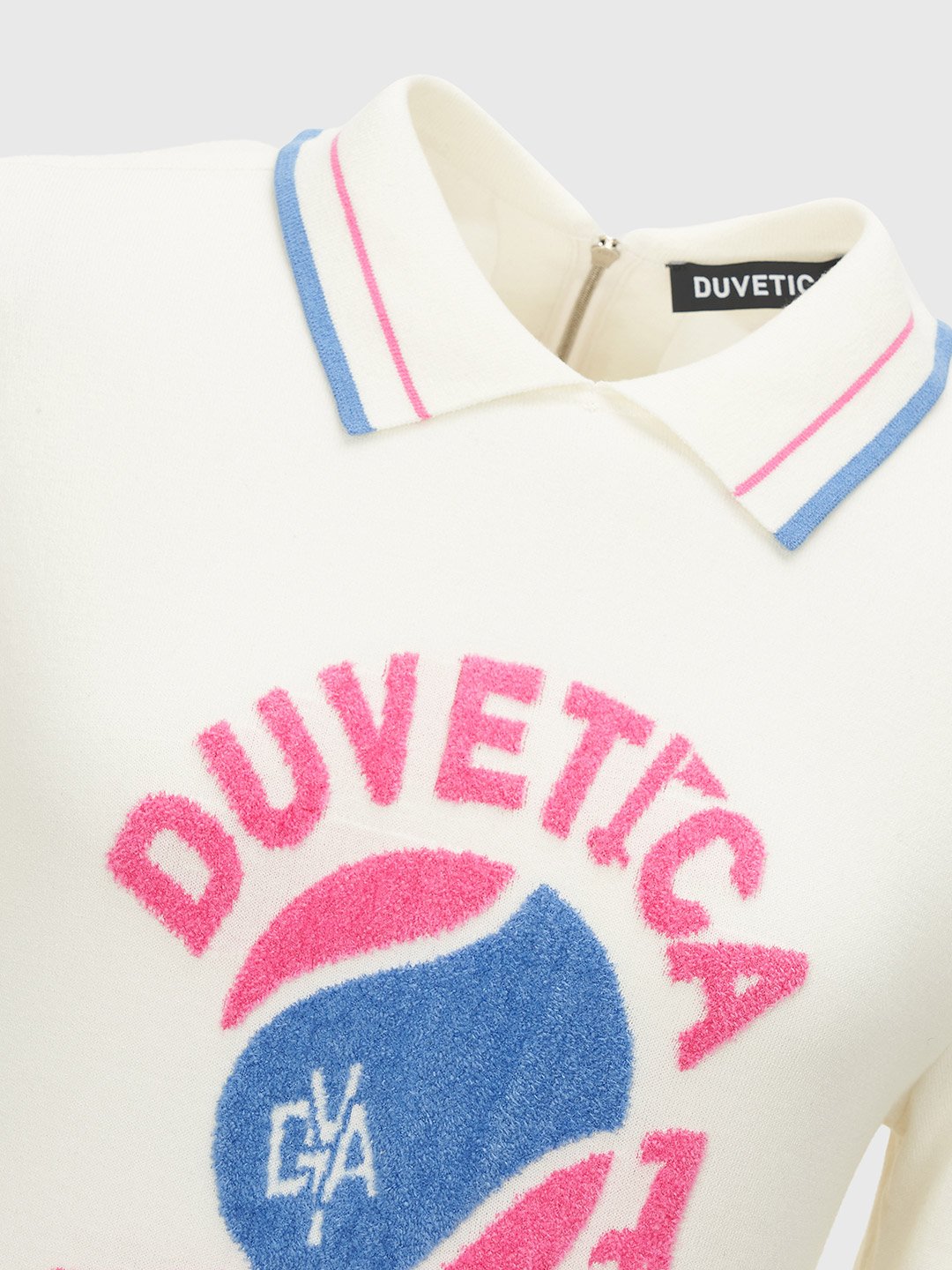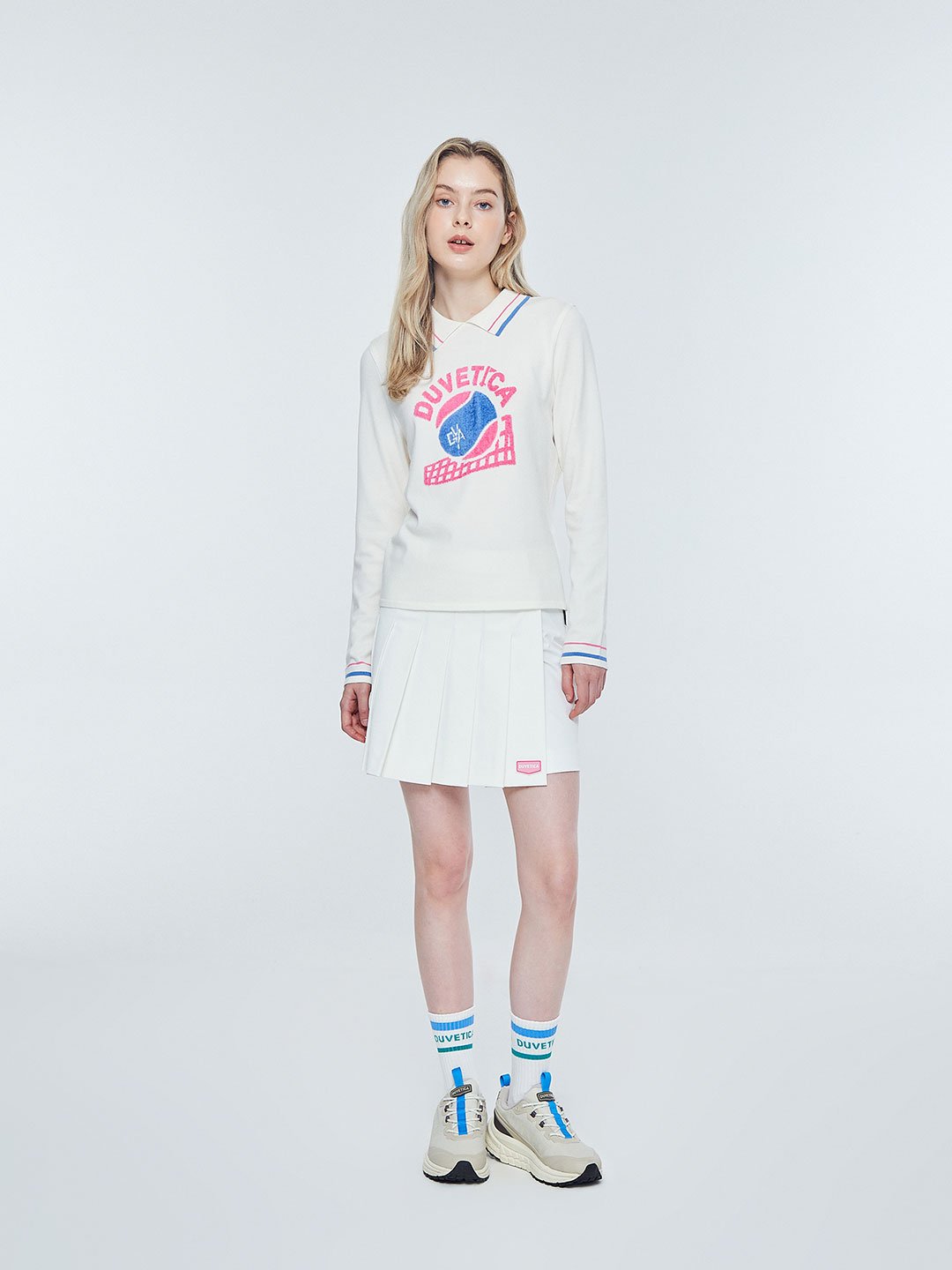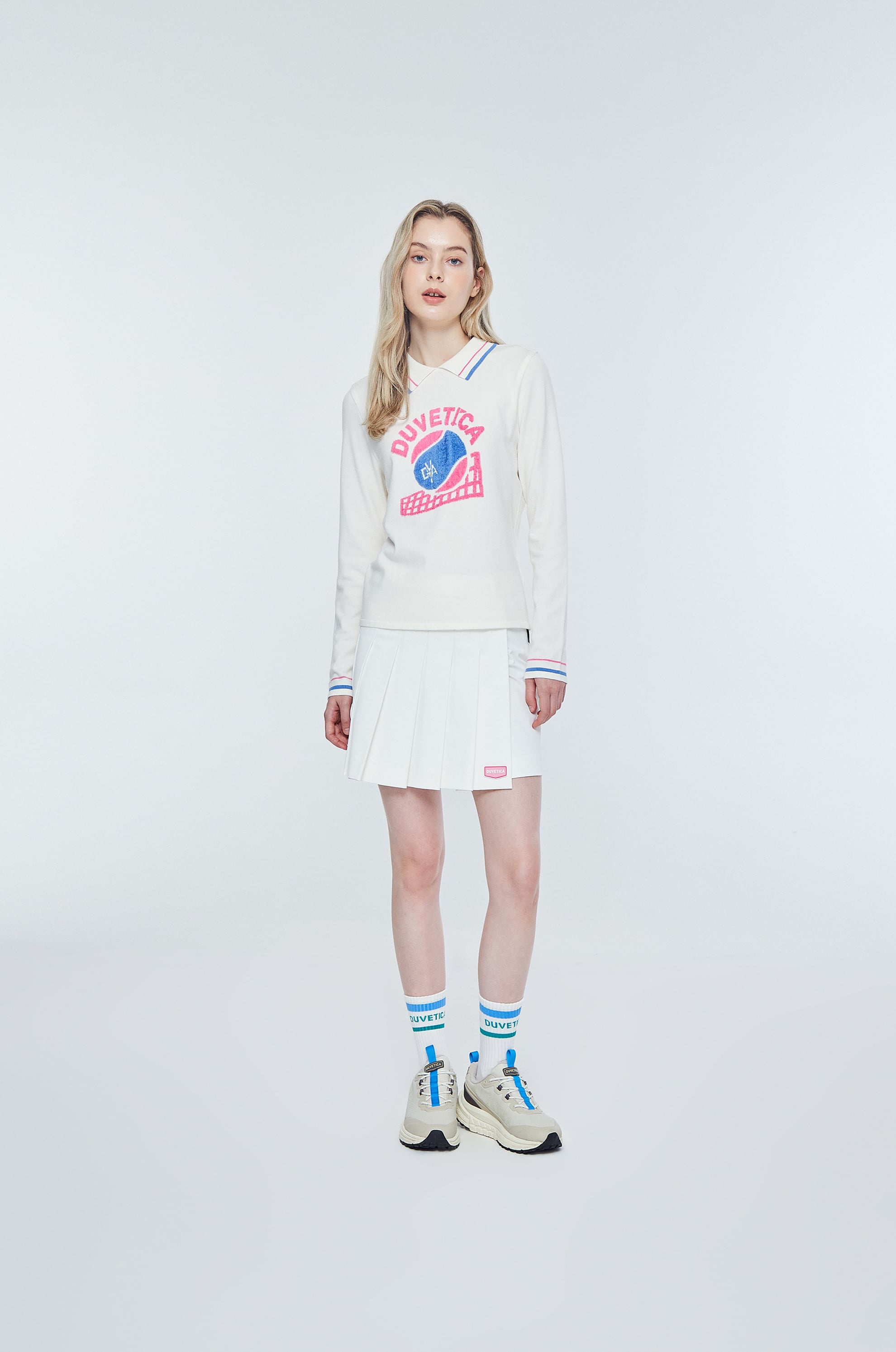- 인타르시아 기법의 테니스 볼, 매트 그래픽, 레터링 로고가 적용된 카라 니트 풀오버