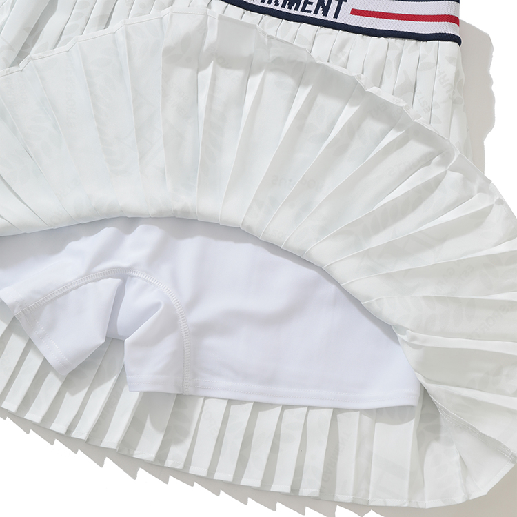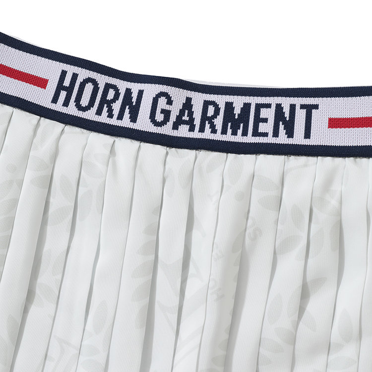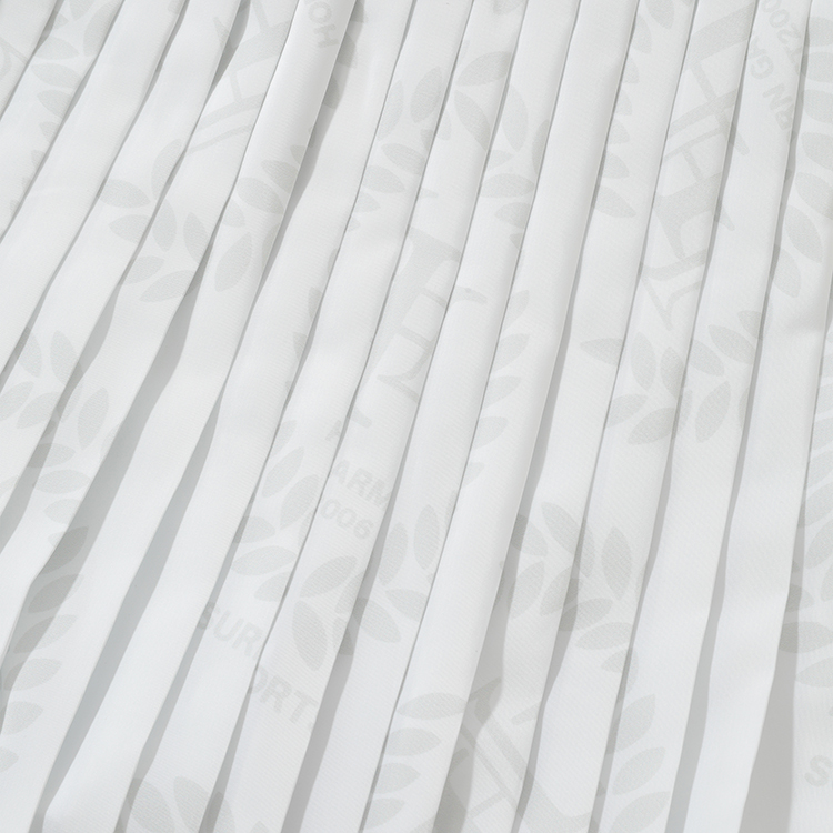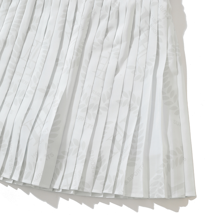 얇지만 튼튼한 폴리에스테르 소재에 오리지널 월계관 패턴을 프린트. 움직임이 있는 얇은 플리츠 스커트로 라운드를 화사하게 연출.