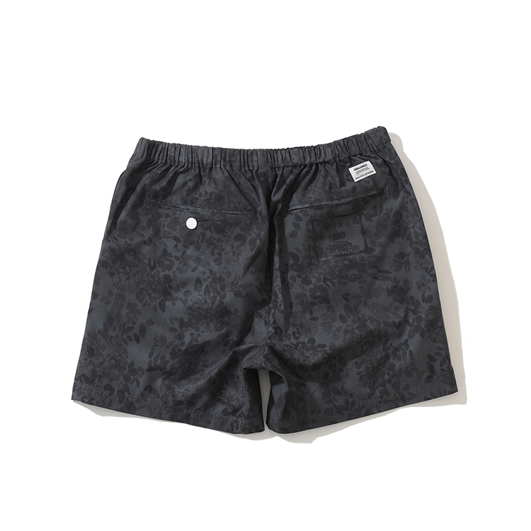 왼쪽 앞자락, 오른쪽 뒤에 각각 [SURFAND SPORTS] 아이콘을 프린트. 왼쪽 포켓에 로고가 각인된 스냅 버튼. 오른쪽 뒷주머니 상단에는 브랜드 라벨 부착