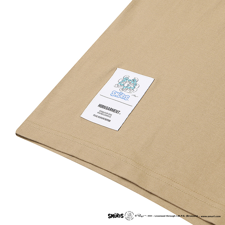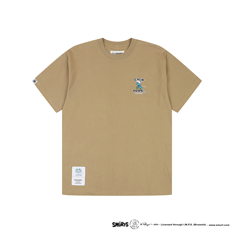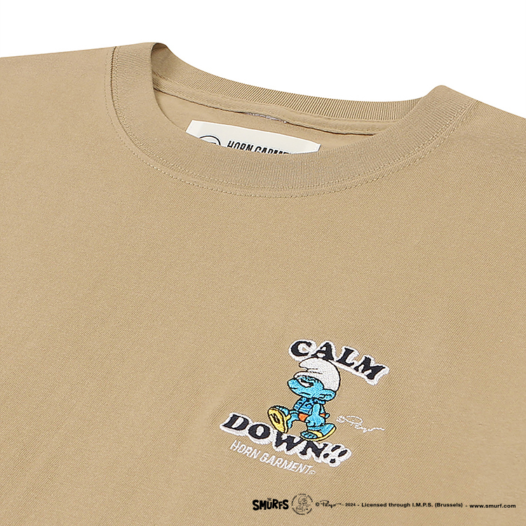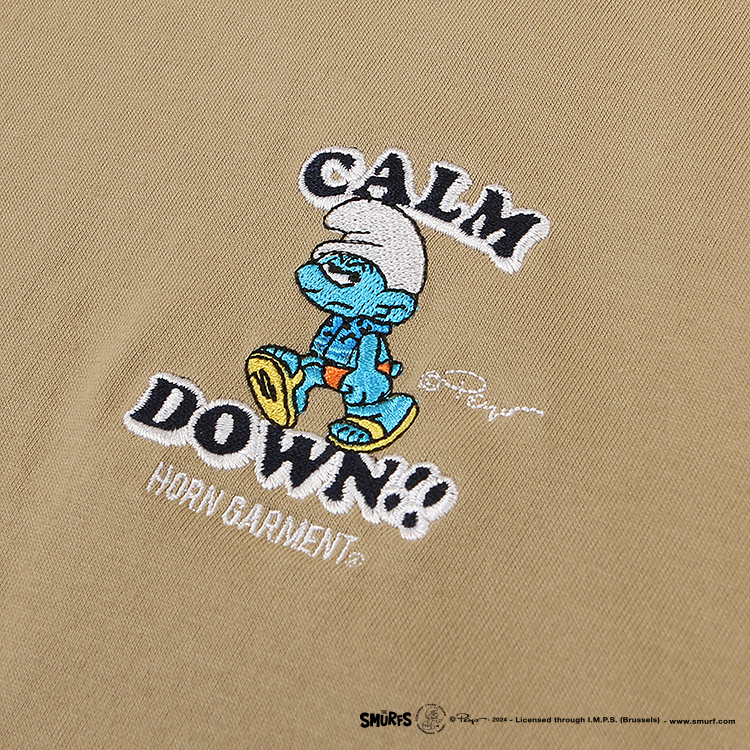 · 왼쪽 가슴에는 [CALM DOWN]과 유니크한 스머프 모티브의 자수. 오른쪽 밑단에는 콜라보레이션 태그를 부착.