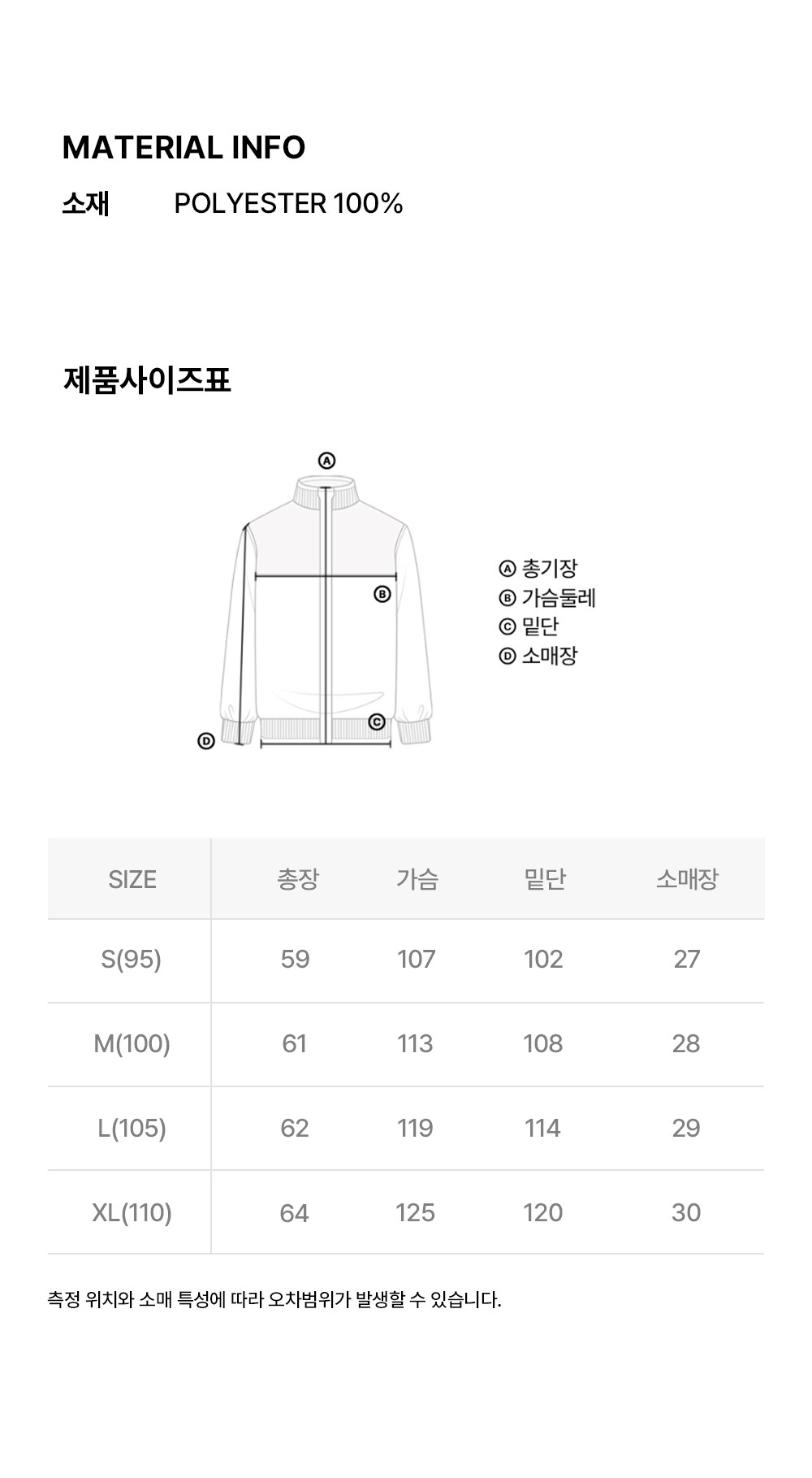 | 세탁방법 및 취급시 주의사항 | 30 °C 이하 손세탁/건조기 금지/단독세탁/물에 불리지 말것/세탁 전 지퍼 닫기/표백제 사용 금지 |
