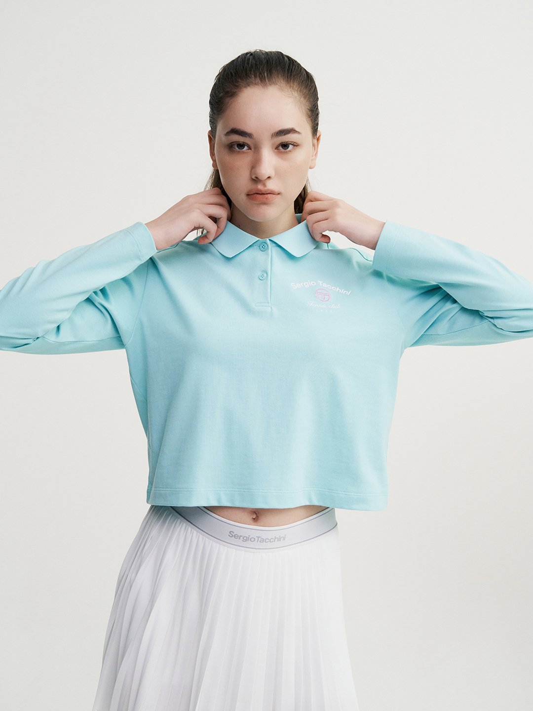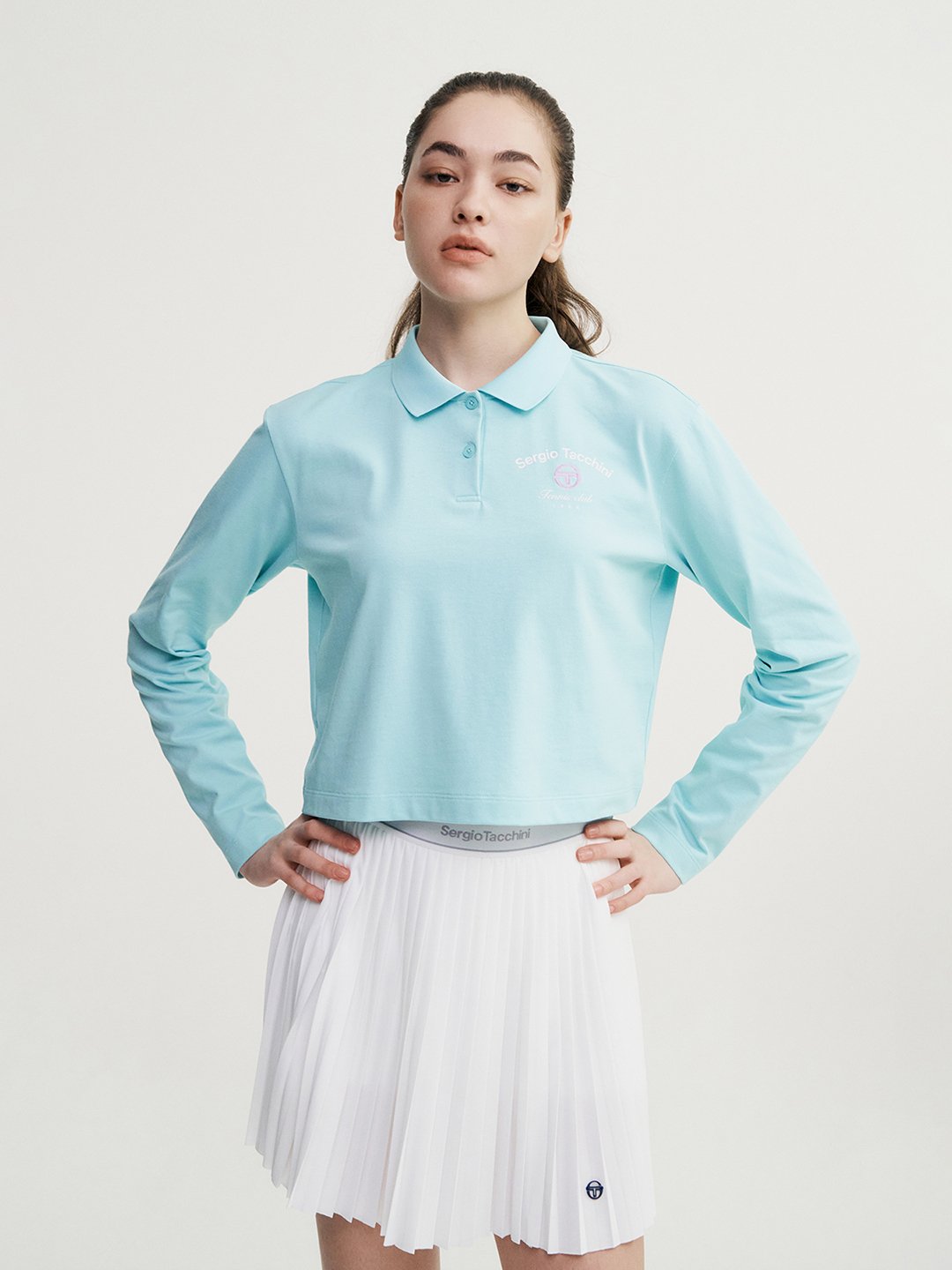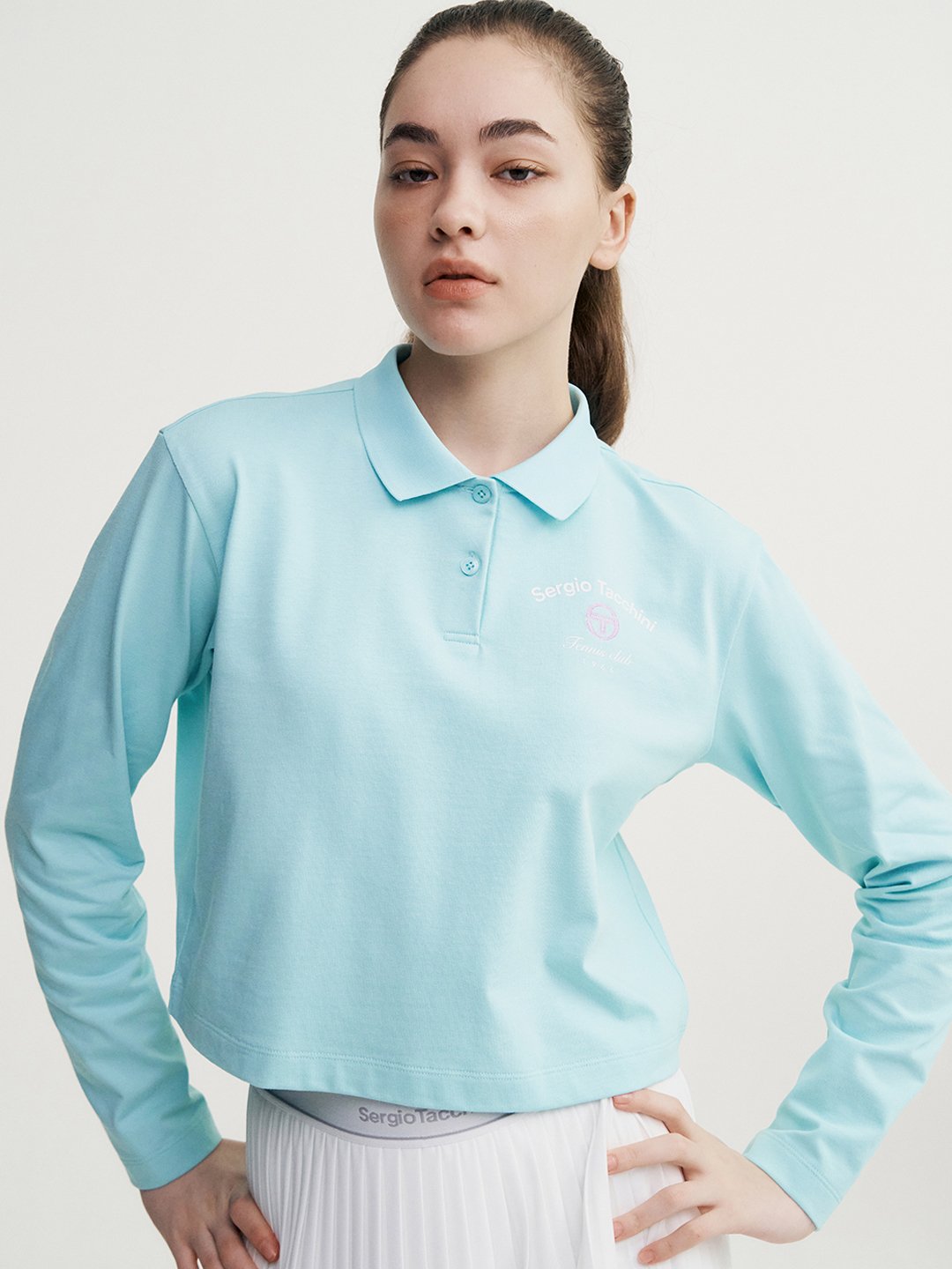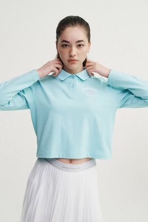 - -가슴의 자수와 프린트 아트웍이 포인트인 크롭기장의 라이프스타일형 긴팔 폴로탑