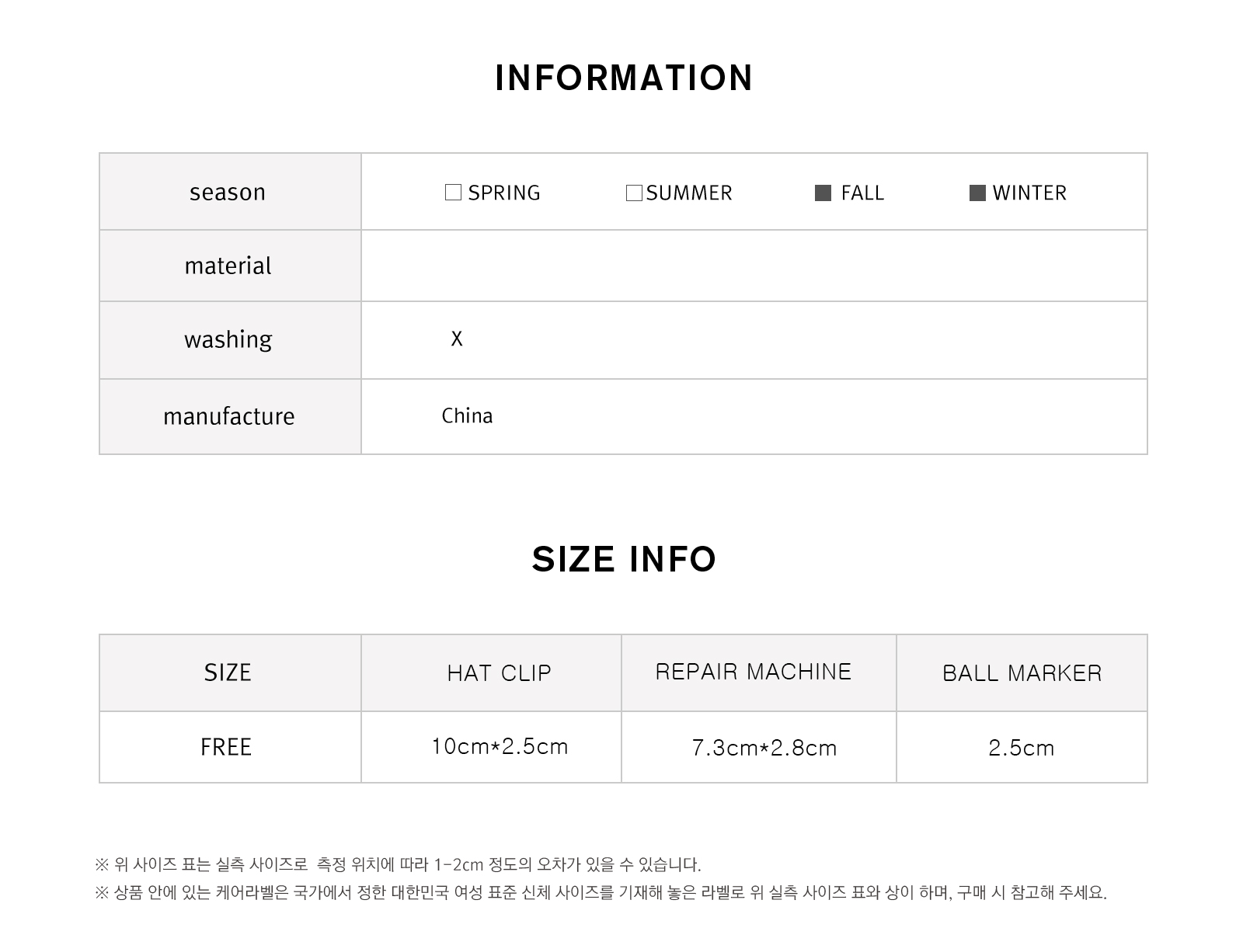 | 크기, 중량 (섬유제품 등의 경우 치수 정보로 대체 가능) | 햇 클립 10cm*2.5cm 그린보수기7.3cm*2.8cm 볼마커 2.5cm |