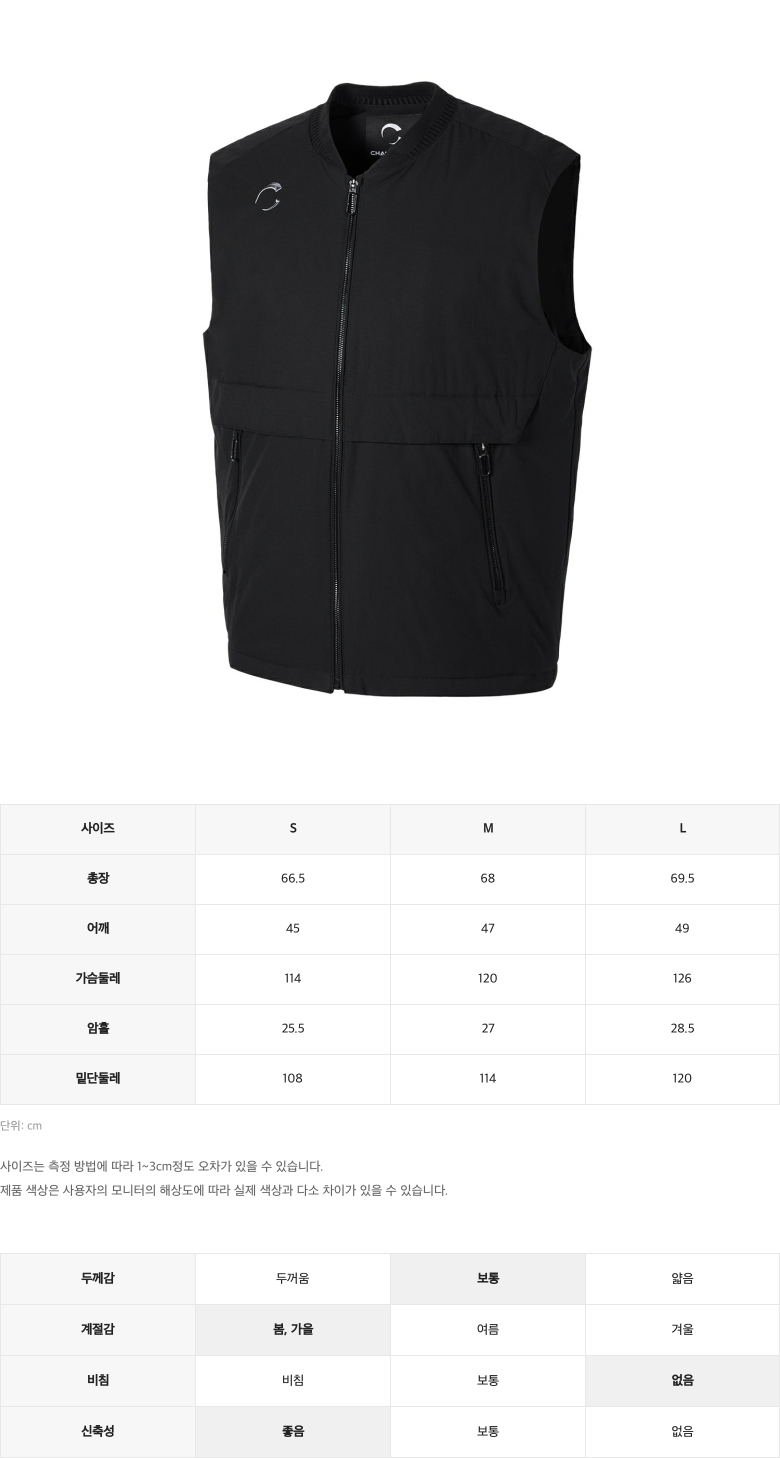 | 소재 | 겉감 : 폴리에스터 100% / 배색 : 폴리에스터 97%, 폴리우레탄 3% / 안감 : 나일론 100% / 충전재 : 폴리에스터 100% / 주머니감 : 폴리에스터 100% / |