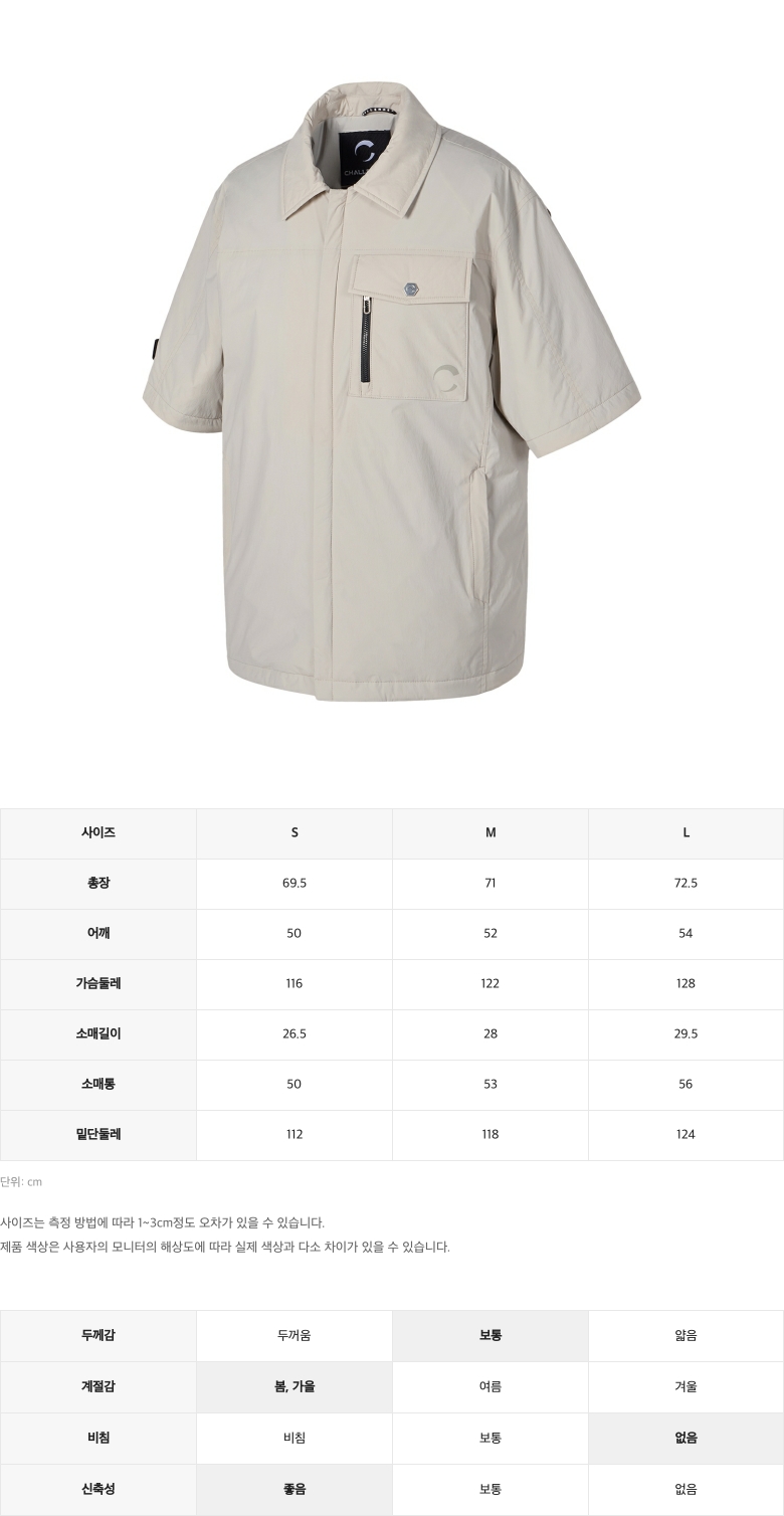 | 소재 | 겉감 : 나일론 95%, 폴리우레탄 5% / 안감1 : 폴리에스터 100% / 안감2 : 폴리에스터 88%, 폴리우레탄 12% / 충전재 : 폴리에스터 100% / 주머니감 : 폴리에스터 100% |