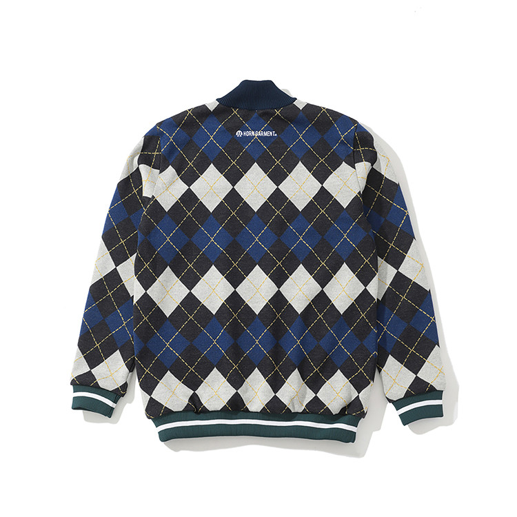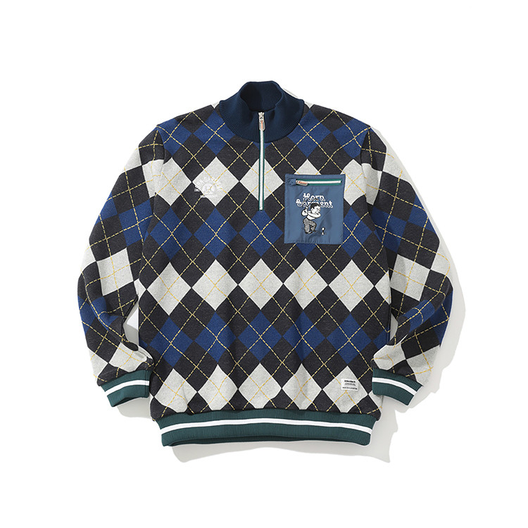클래식한 느낌의 아가일 패턴에 하이톤 컬러를 MIX하고 칼라와 밑단, 소매단의 폴리에스테르 리브로 다른 소재감을 주어 스포츠 테이스트로 완성.