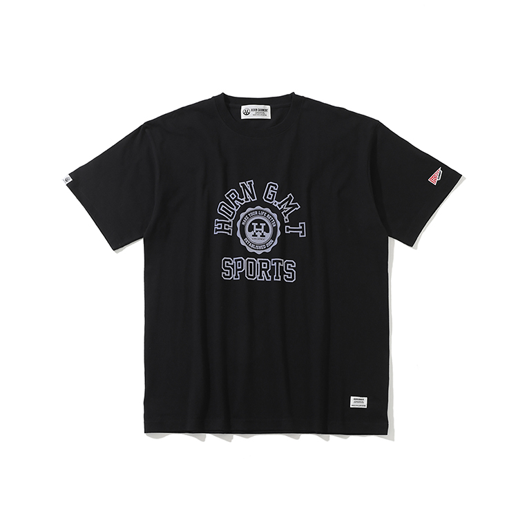 HORN GARMENT 컬리지 아이콘을 사용하여 고전적인 인상으로 완성한 남여공용 전개의 캐주얼 코튼 Tee.