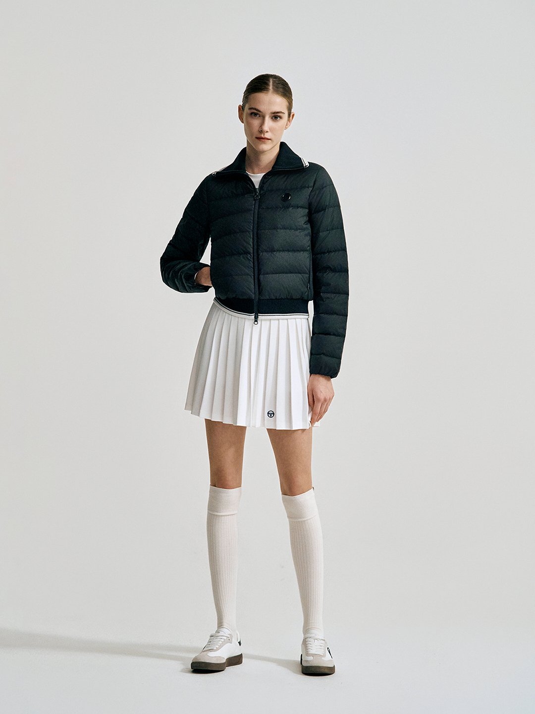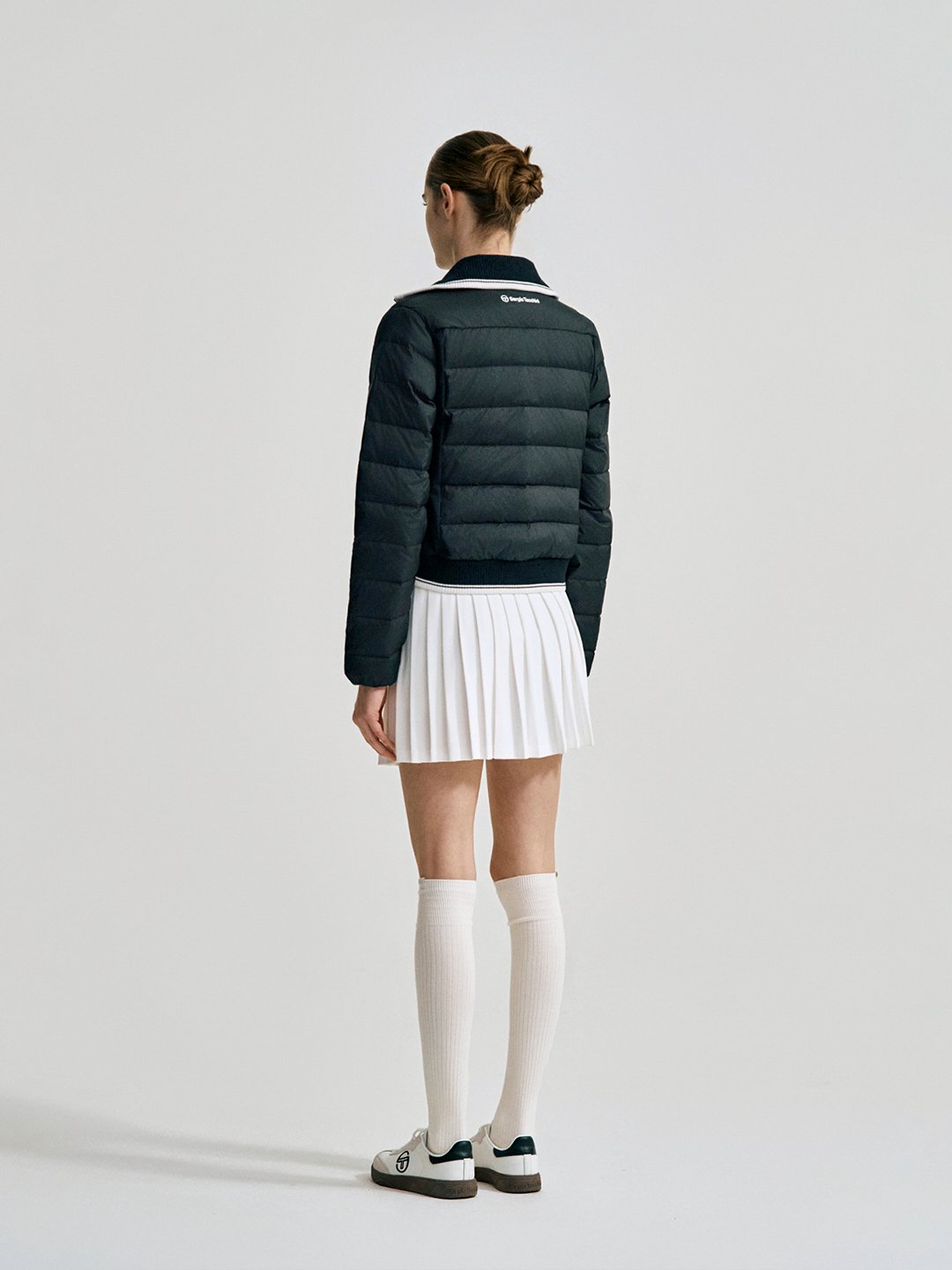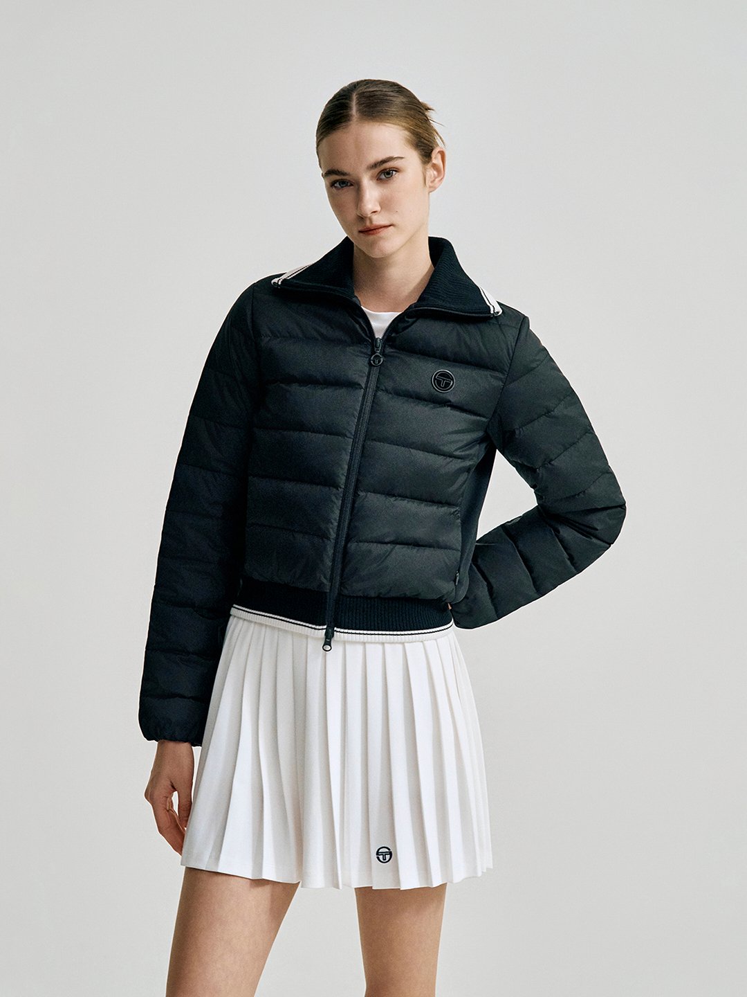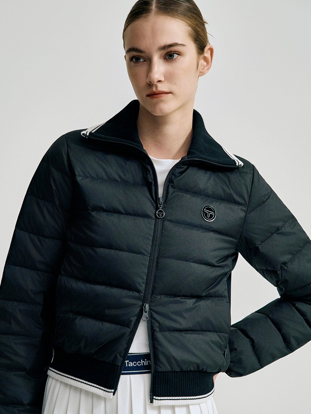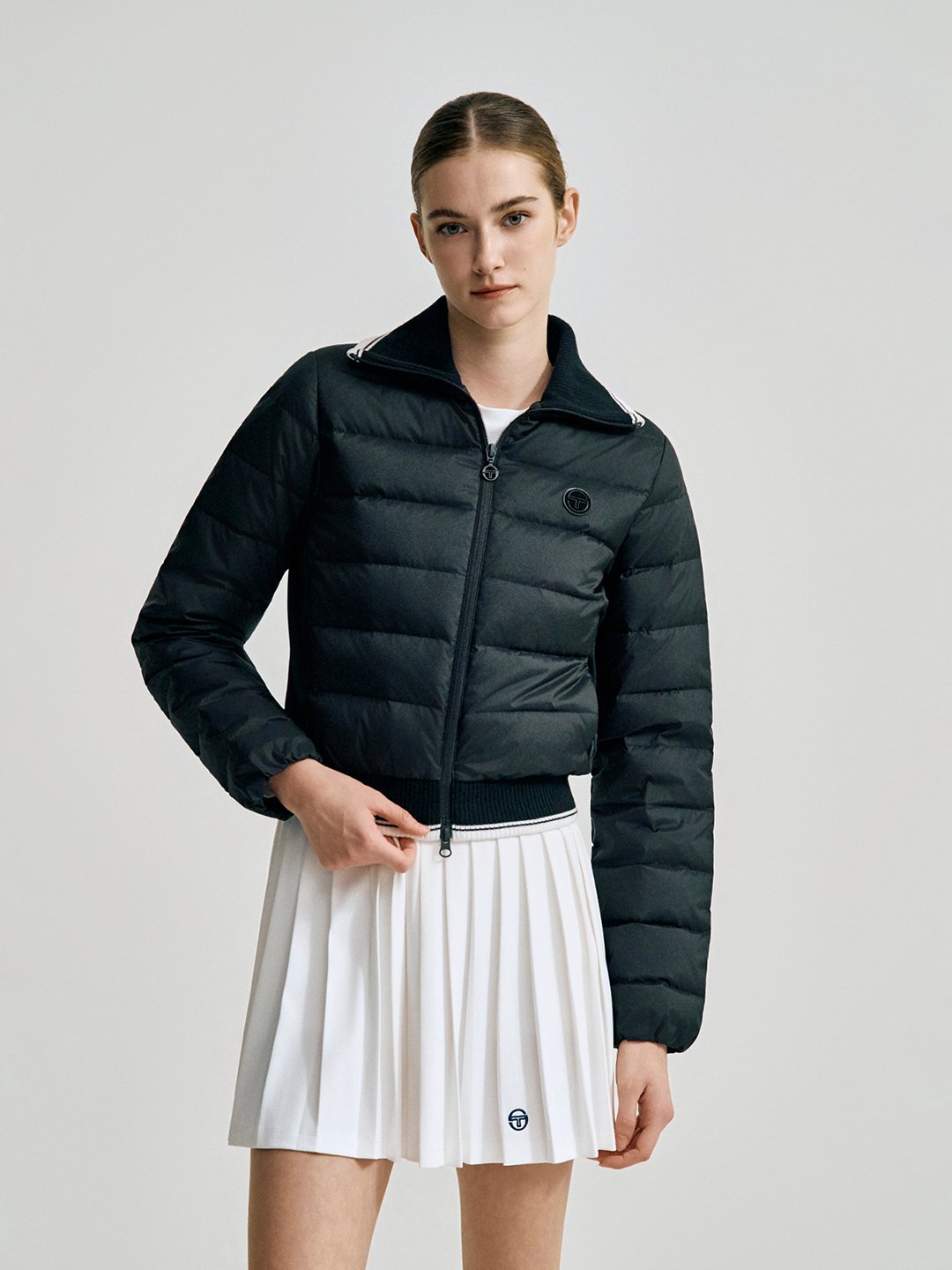 - -사이드 패널에 저지 원단이 믹스되어 활동성이 강화된 카라넥 크롭 다운점퍼