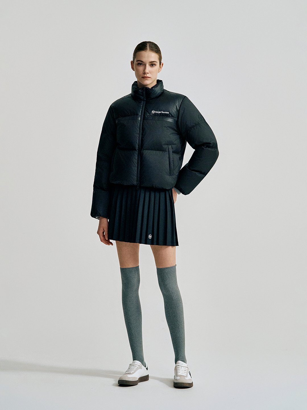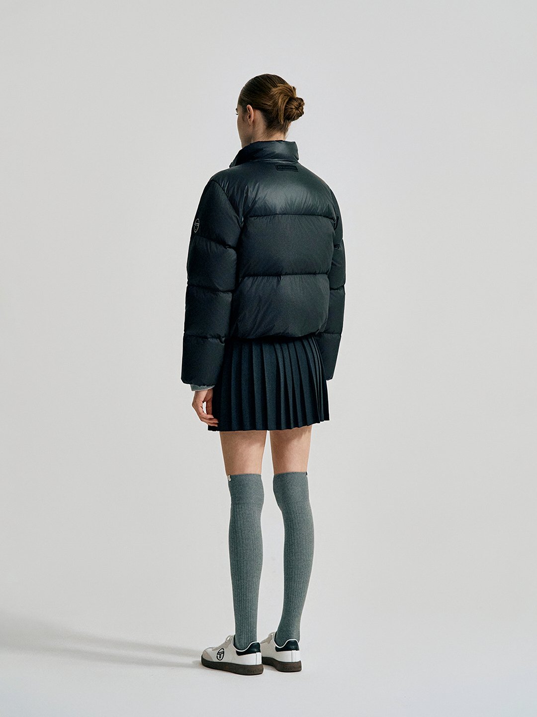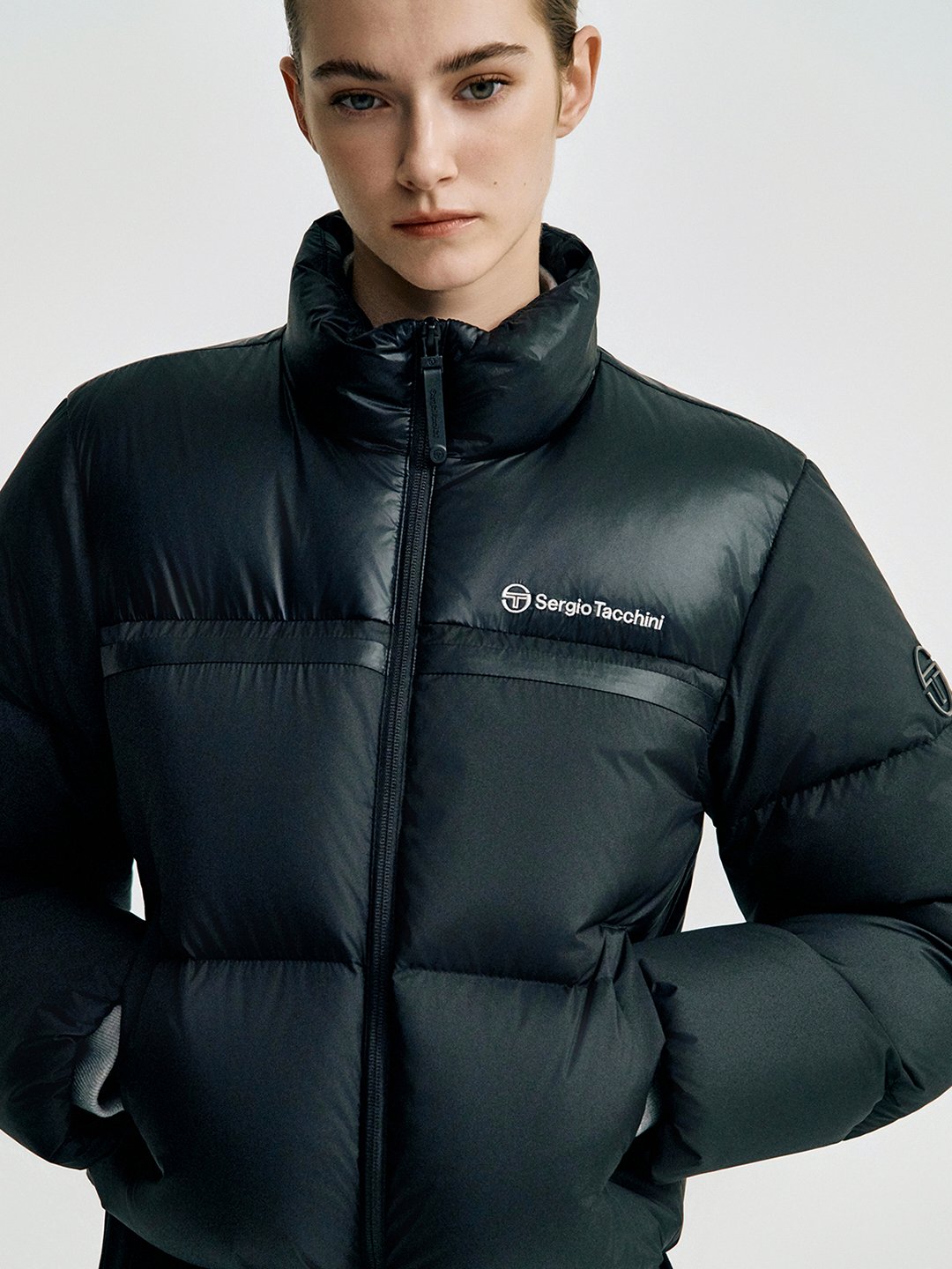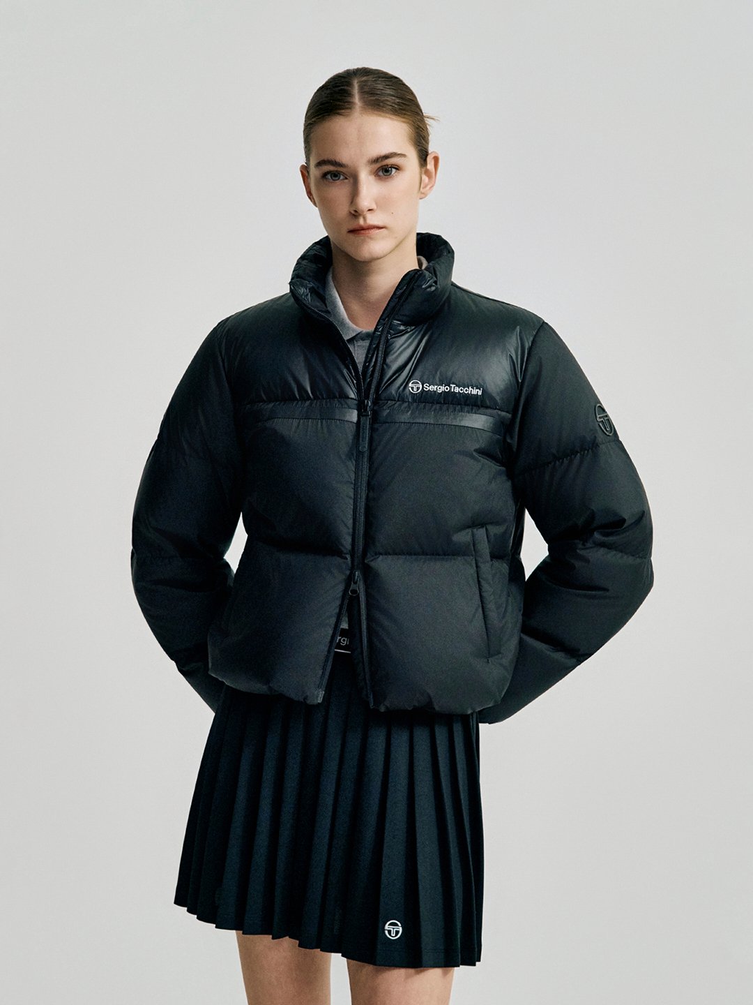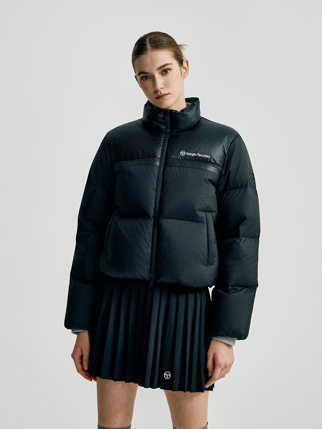 - - 광택감 있는 소재의 다마린도 컬러블록이 적용된 숏 다운점퍼