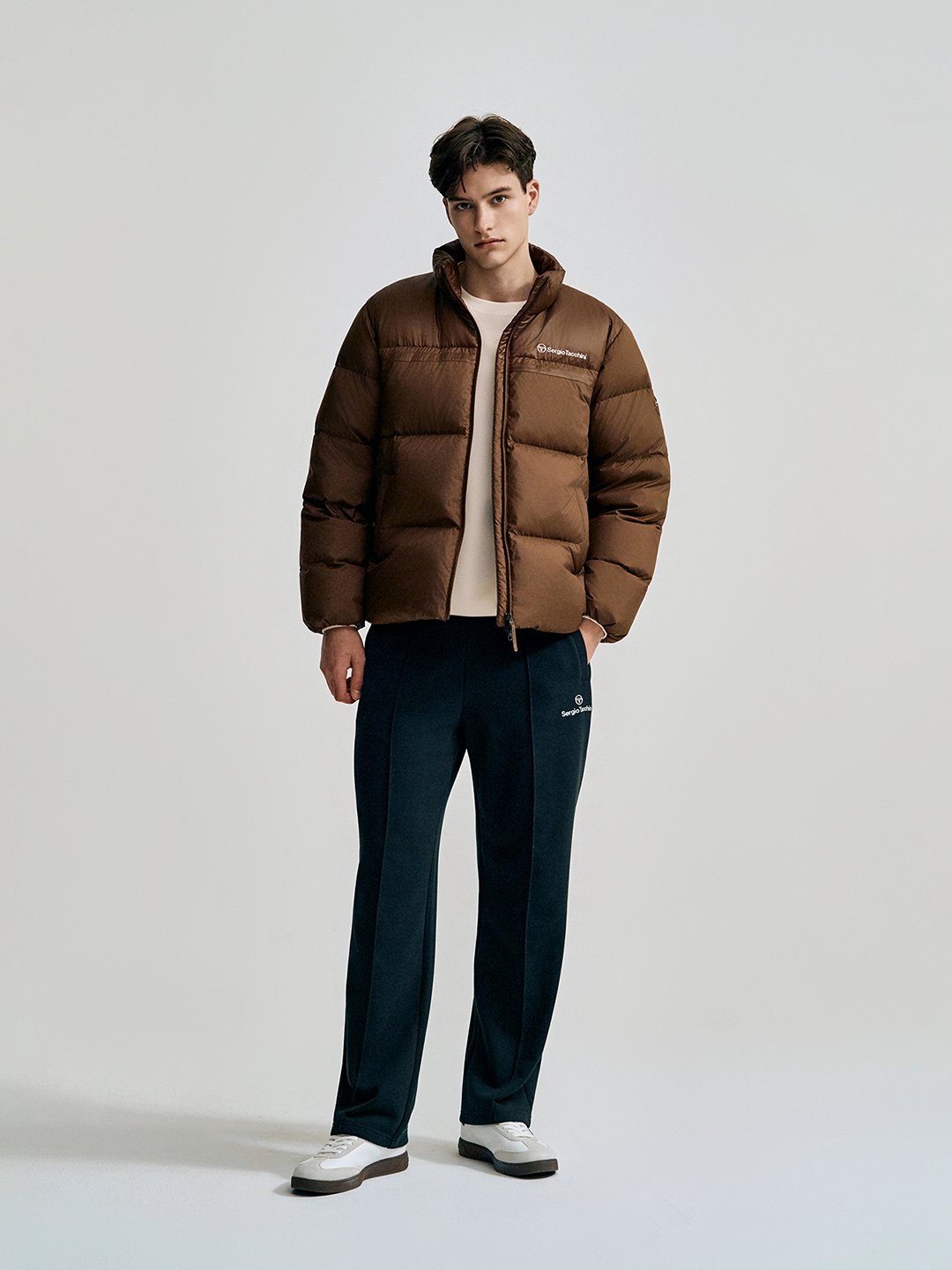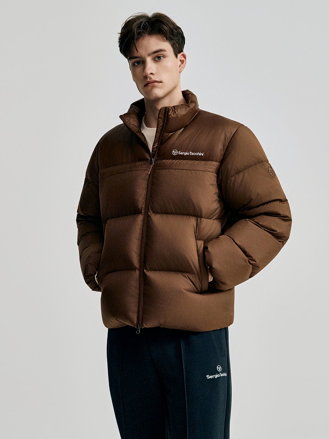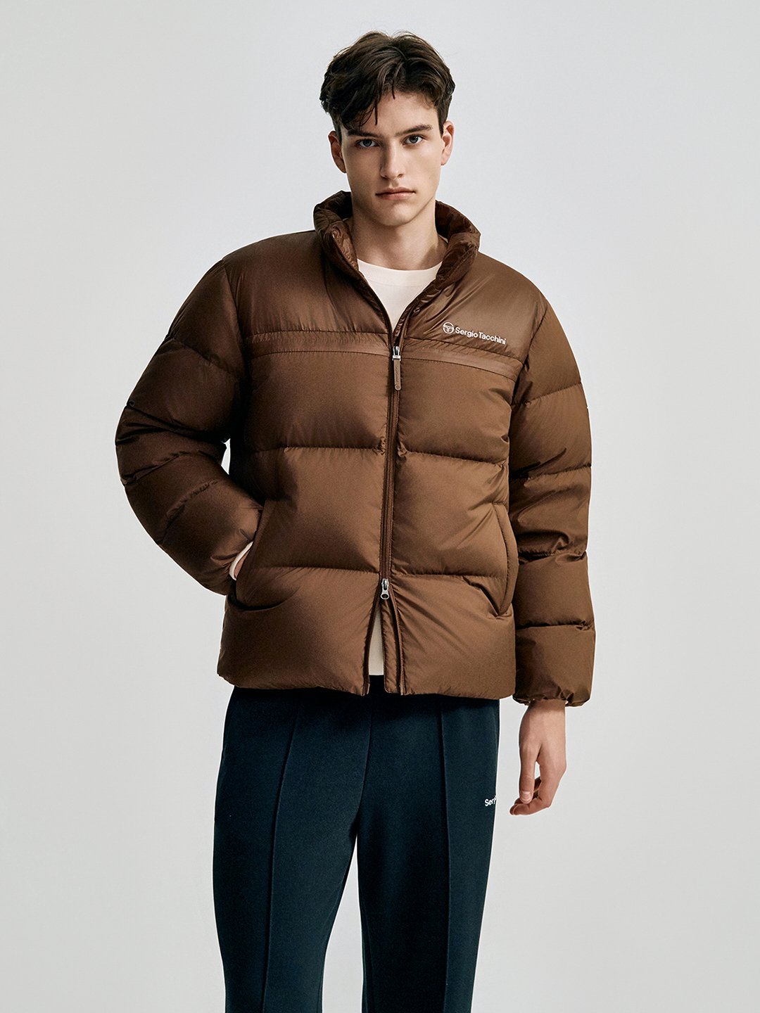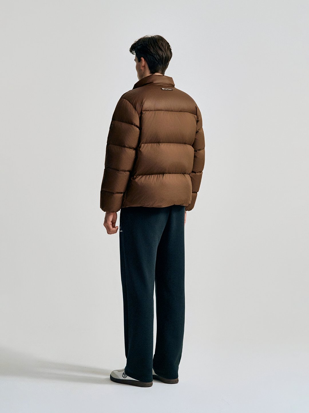 - - 광택감 있는 소재의 다마린도 컬러블록이 적용된 숏 다운점퍼