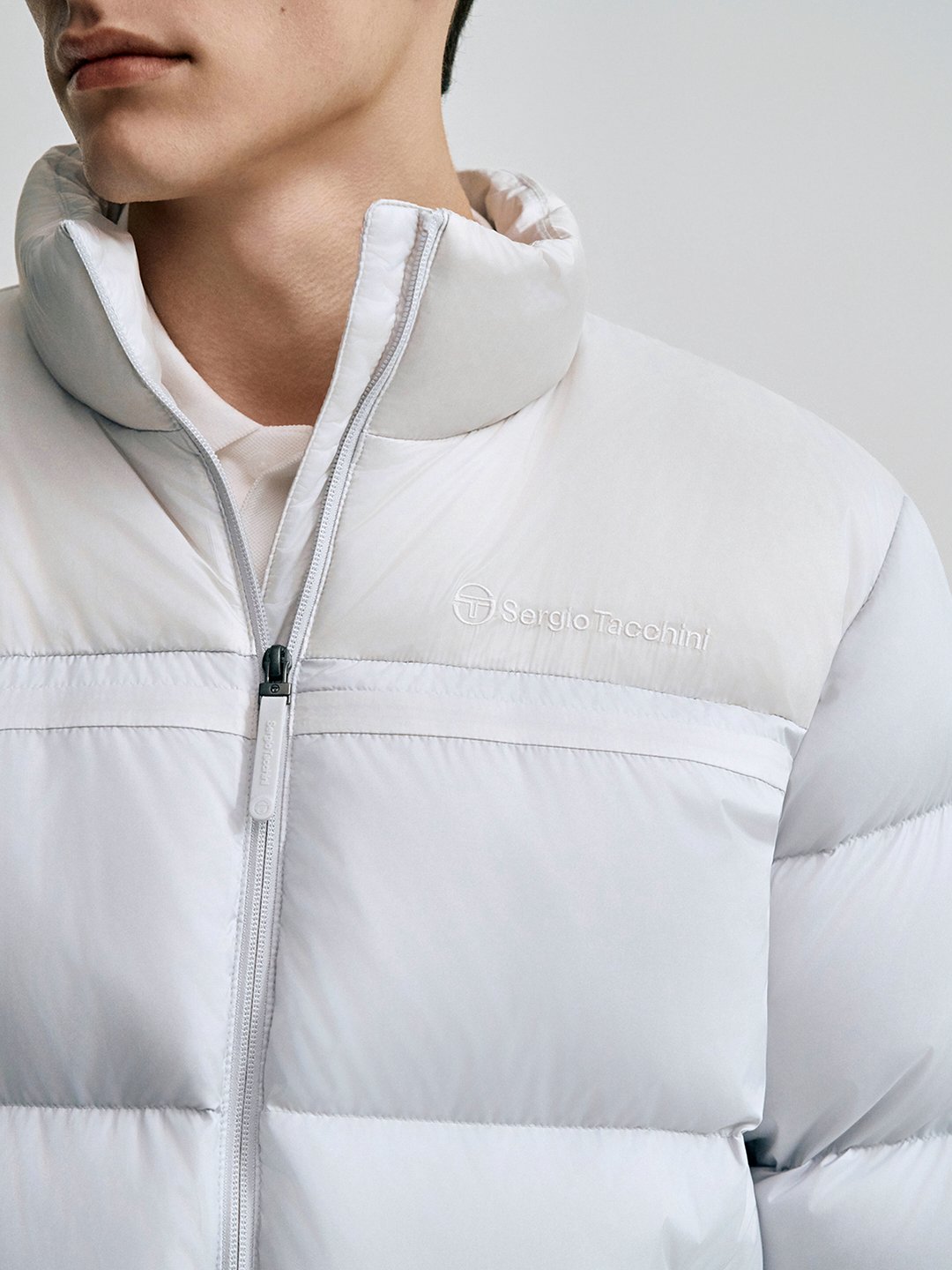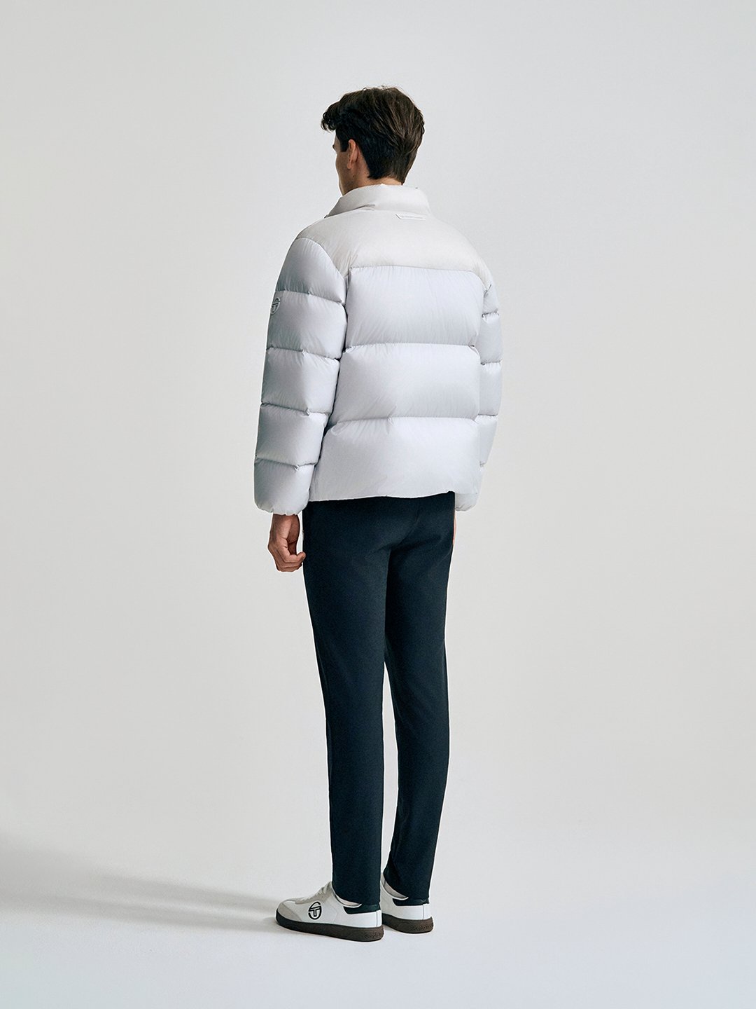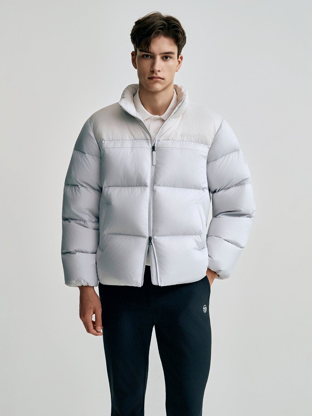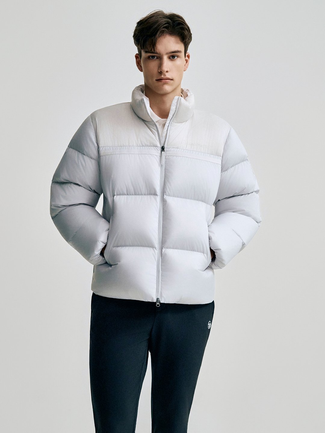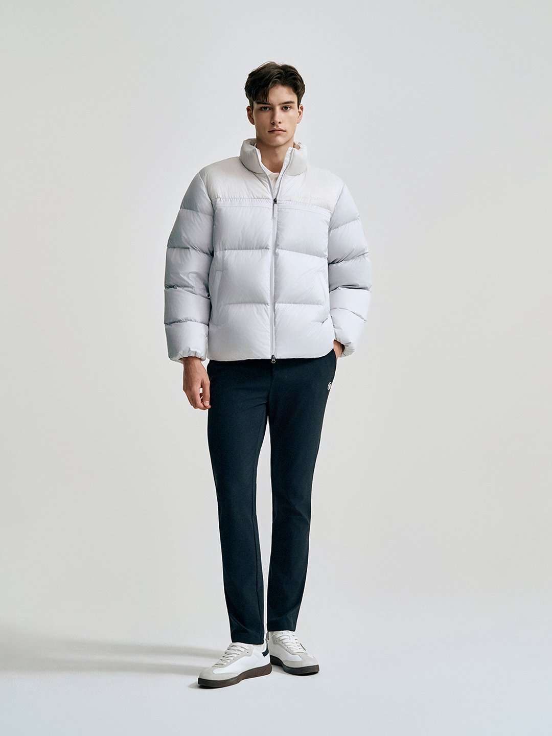 - - 광택감 있는 소재의 다마린도 컬러블록이 적용된 숏 다운점퍼
