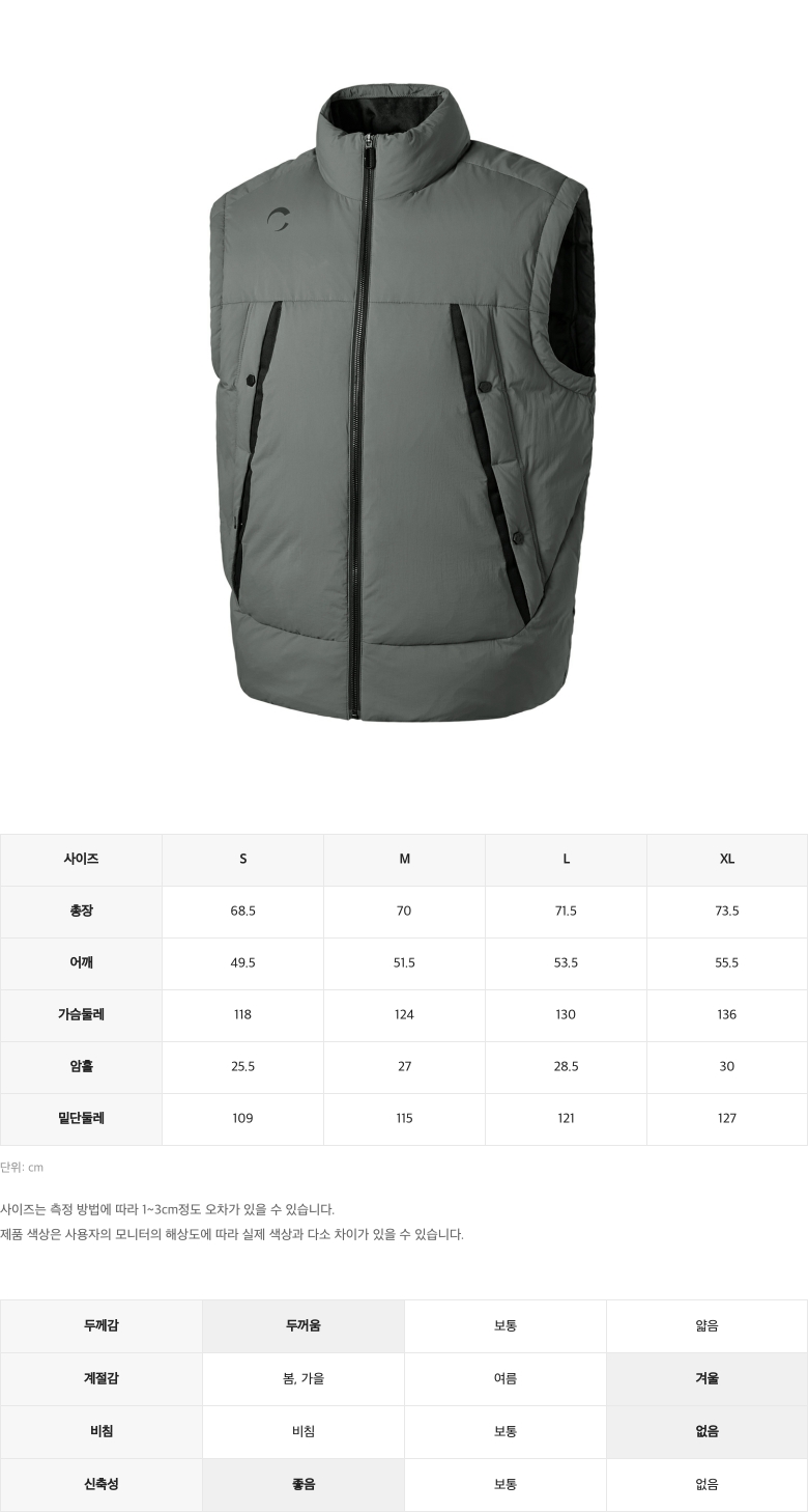| 소재 | 겉감 : 나일론 100% / 배색 : 폴리에스터 100% / 안감 : 나일론 100% / 주머니감 : 폴리에스터 100% / 충전재1 : 솜털/거위 90%, 깃털/거위 10% / 충전재2 : 폴리에스터 100% |