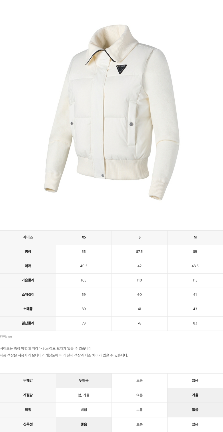 | 소재 | 겉감 : 폴리에스터 100% / 배색1 : 폴리에스터 25%, 아크릴 52%, 나일론 14%, 비스코스 5.5%, 모 3.5% / 배색2 : 폴리에스터 100% / 안감1 : 폴리에스터 100% / 안감2 : 폴리에스터 100% / 주머니감 : 폴리에스터 100% / 충전재1 : 솜털(거위) 90%, 깃털(거위) 10% / 충전재2 : 폴리에스터 100% |