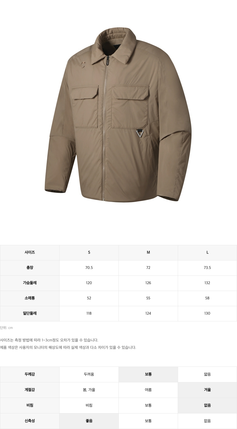 | 소재 | 겉감 : 나일론 96%, 폴리우레탄 4% / 안감 : 폴리에스터 100% / 주머니감 : 폴리에스터 100% / 충전재 : 폴리에스터 100% |