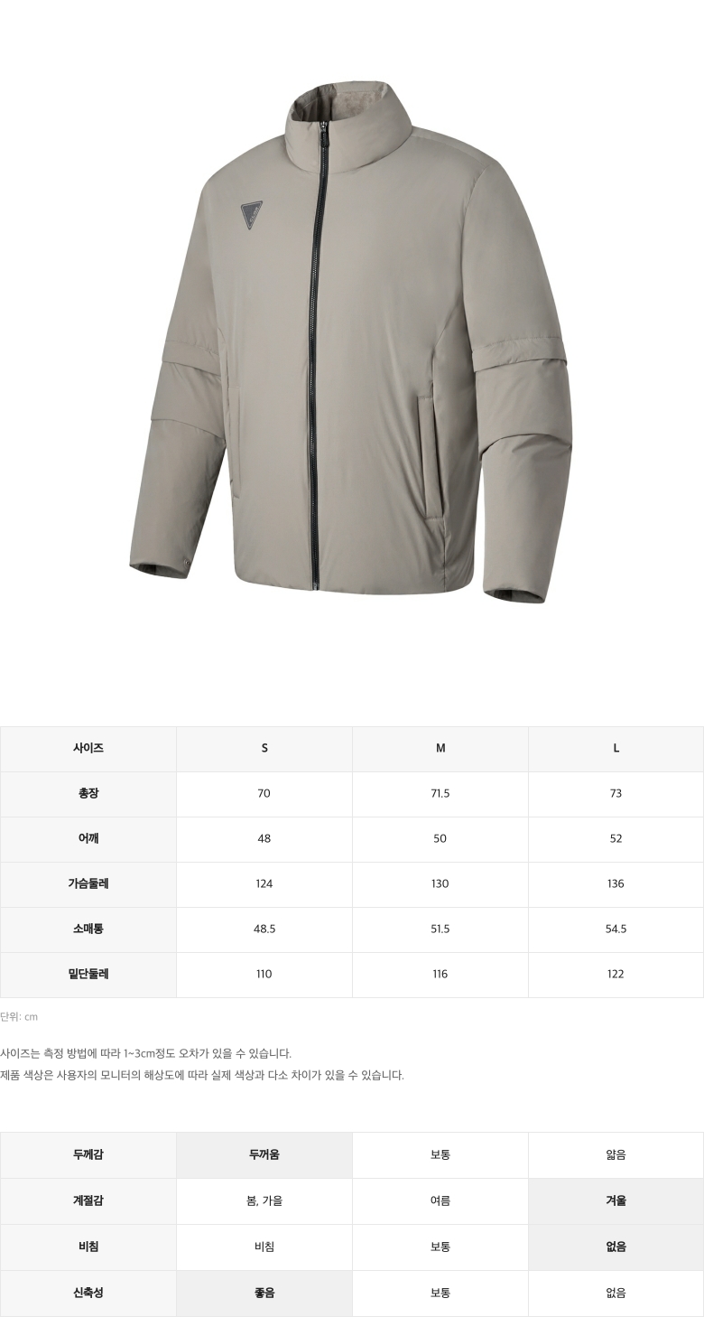 | 소재 | 겉감 : 나일론 82%, 폴리우레탄 18% / 배색 : 폴리에스터 100% / 안감1 : 폴리에스터 100% / 안감2 : 나일론 92%, 폴리우레탄 8% / 주머니감 : 폴리에스터 100% / 충전재1 : 솜털/거위 90%, 깃털/거위 10% / 충전재2 : 폴리에스터 100% / |