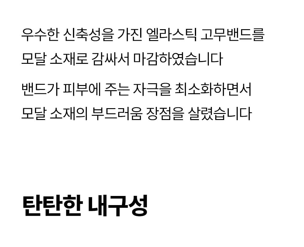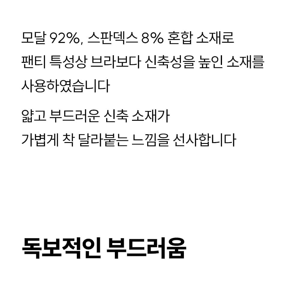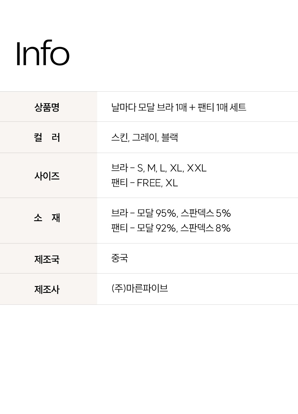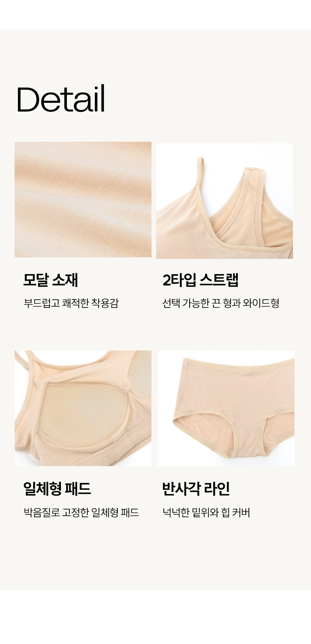 | 소재 | 브라: 모달95%, 스판덱스 5% 팬티: 92%, 스판덱스 8% |