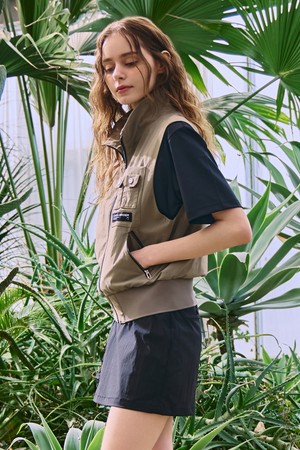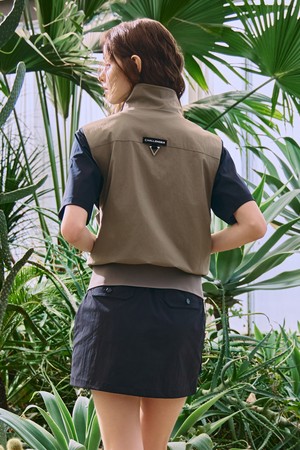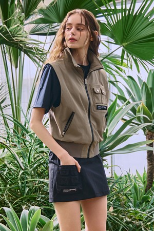 여성 포켓 장식 카라넥 베스트 카키베이지