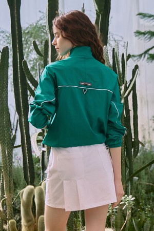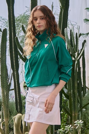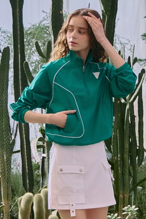 여성 디테일 변형 반집업 하이넥 우븐탑 그린