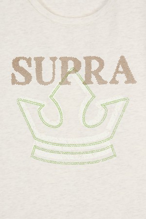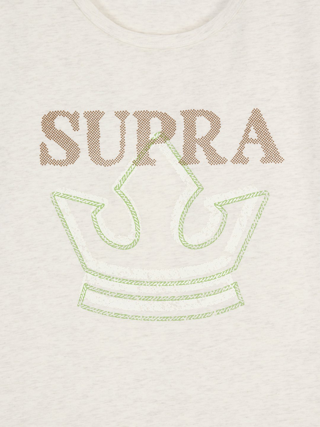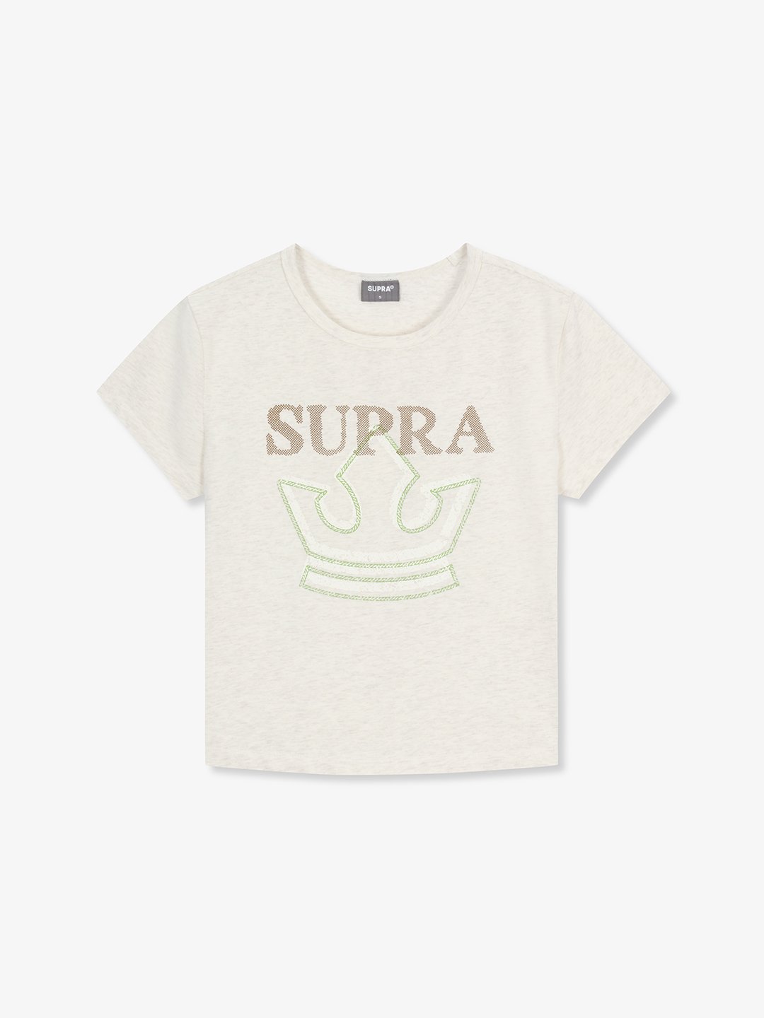 - 컬러풀한 오버랩 크라운 프린트가 포인트인 반팔 티셔츠