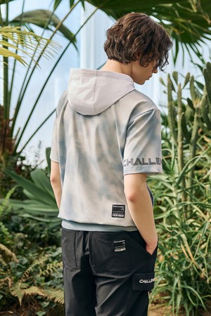 남성 빅로고 프린트 후드 반팔 우븐탑 그레이