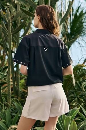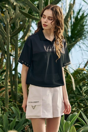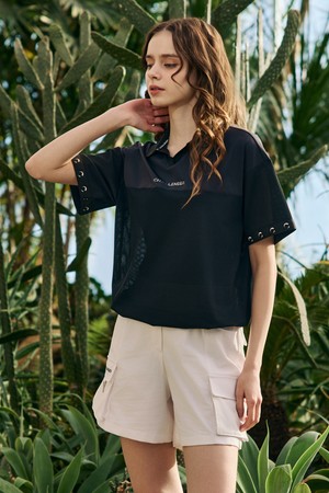 여성 냉감 트리코트 엠보 메쉬 믹스 카라 반팔 티셔츠 블랙