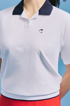 여성 PQ소재 배색 오픈 카라 반팔 티셔츠 화이트
