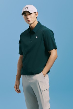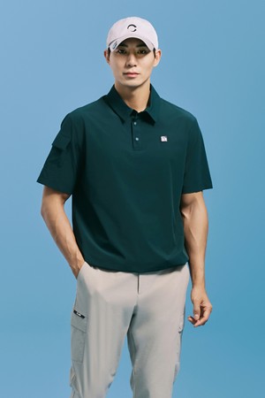 남성 에센셜 나일론 스트레치 카라 반팔 우븐탑 다크그린