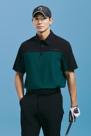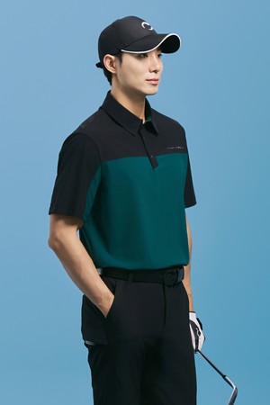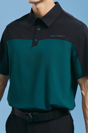 남성 트리코트 컬러블록 카라 반팔 티셔츠 다크그린