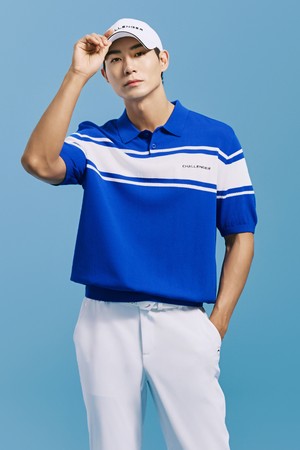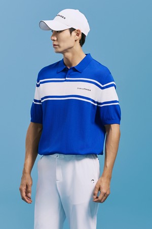 남성 배색 스트라이프 카라 니트 풀오버 블루