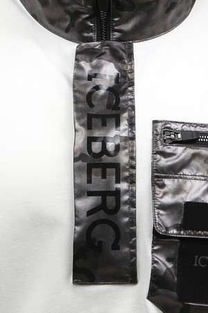 - 앞 플라켓 로고 프린트와 우븐 포켓 포인트.
